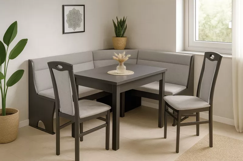 Entdecken Sie unsere hochwertige Eckbankgruppe mit Stauraum, die stilvolles Design mit praktischer Funktionalität vereint – perfekt für Ihre Küche oder das Esszimmer. Diese moderne Sitzgruppe besteht aus einer Truheneckbank (125x165 cm Schenkelmaß), einem ausziehbaren Esstisch mit zwei Ansteckplatten und zwei bequemen Massivholzstühlen.