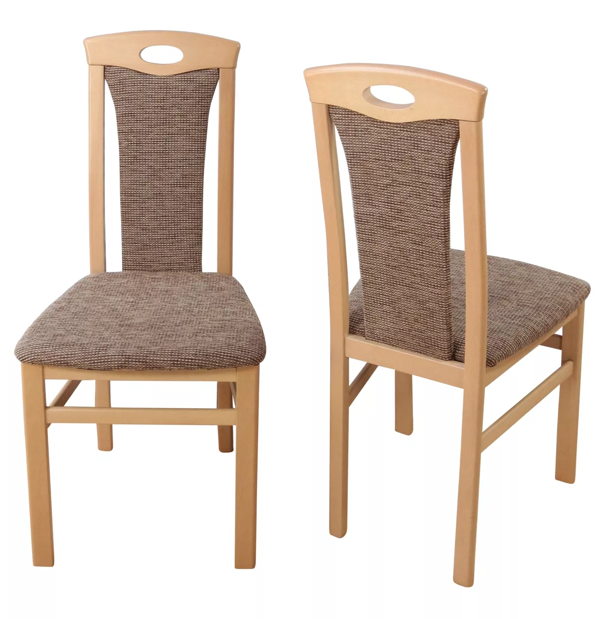 Polsterstuhl im 2er-Set aus Massivholz Buche natur, lackiert. Sitz und Rücken sind bequem schaumstoffgepolstert und mit einem pflegeleichten Stoffbezug (43% Polyacryl/36% Polyester/21% Baumwolle) bezogen.