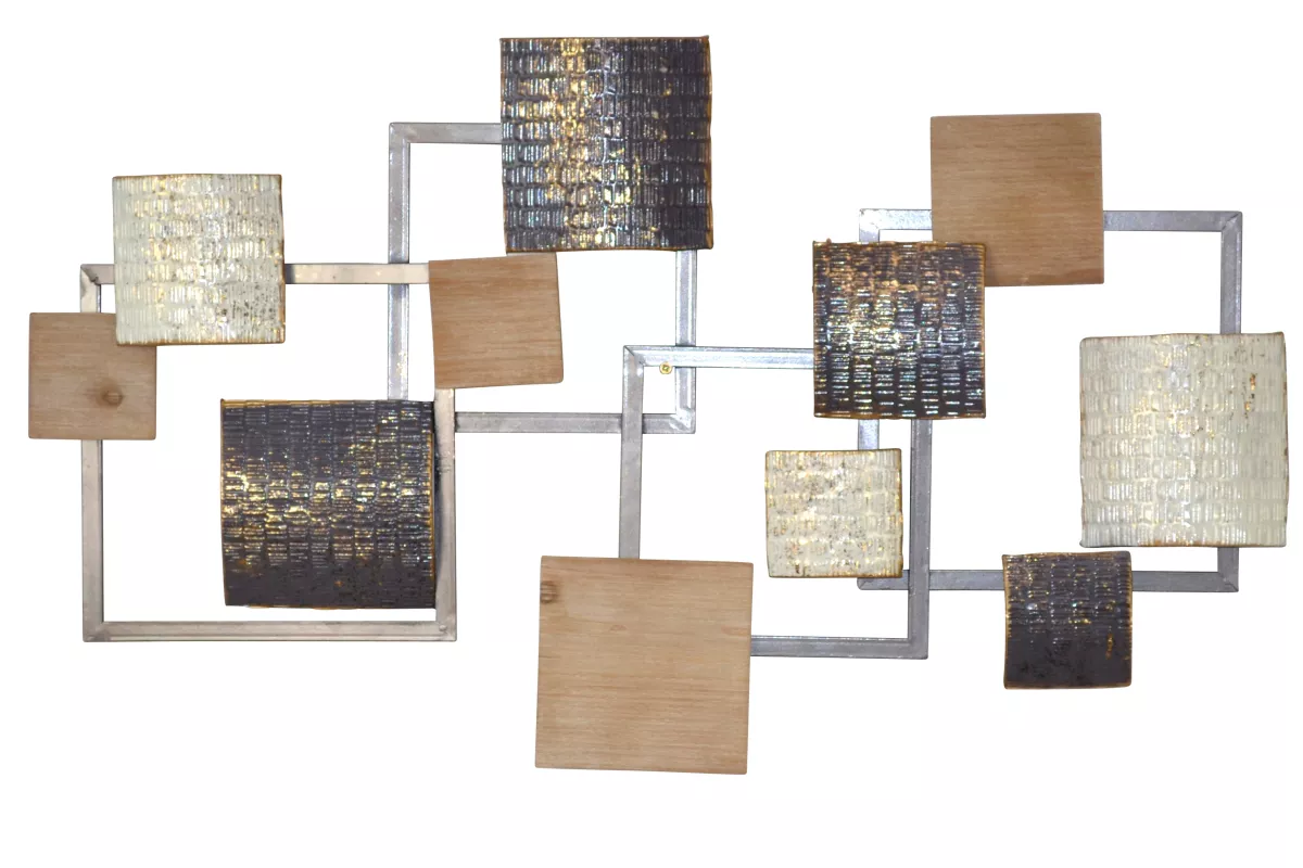 Die Metall Wanddekoration „Iris“ kombiniert modernes Design mit natürlicher Wärme. Dieses abstrakte Wandobjekt überzeugt durch seine spannende Komposition aus geometrischen Vierecken in unterschiedlichen Farben und Materialien. Ob im Wohnzimmer, Flur, Esszimmer oder Büro – die stilvolle Wanddeko wird garantiert zum Blickfang in jedem Raum.
