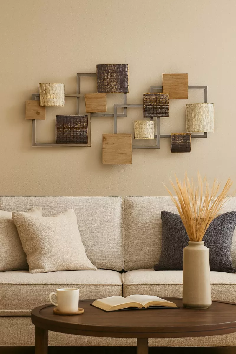 Ob horizontal über dem Sofa oder vertikal im Flur – diese Wanddekoration aus Metall und Holz bringt Struktur, Tiefe und Stil in Ihr Zuhause.