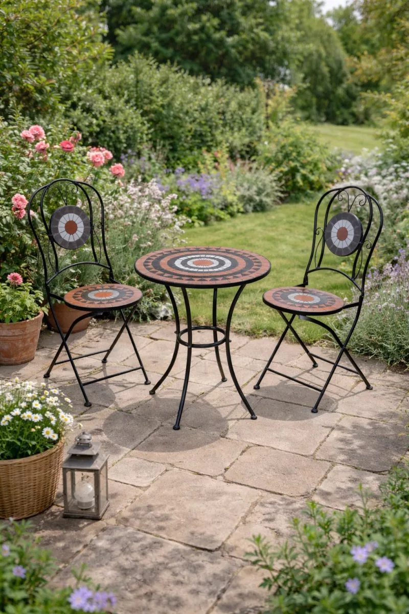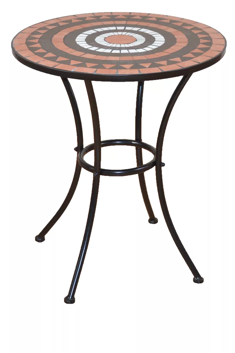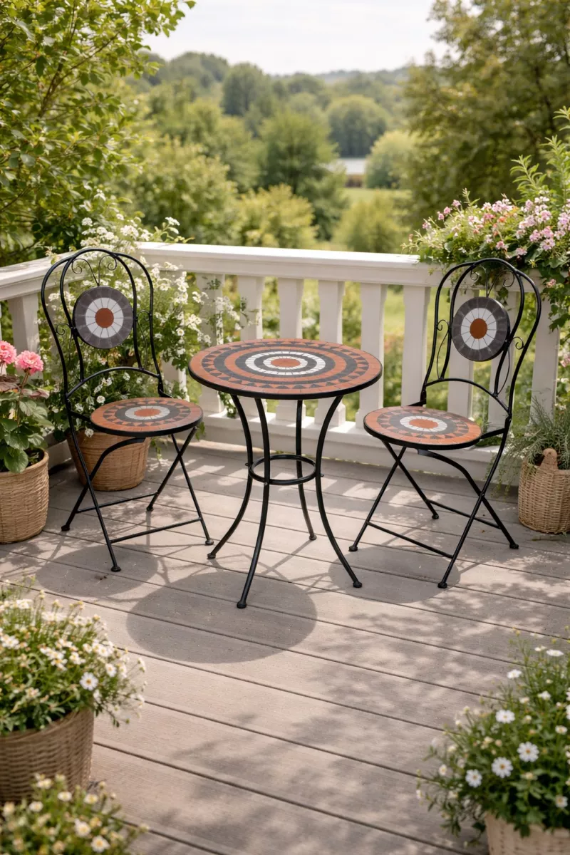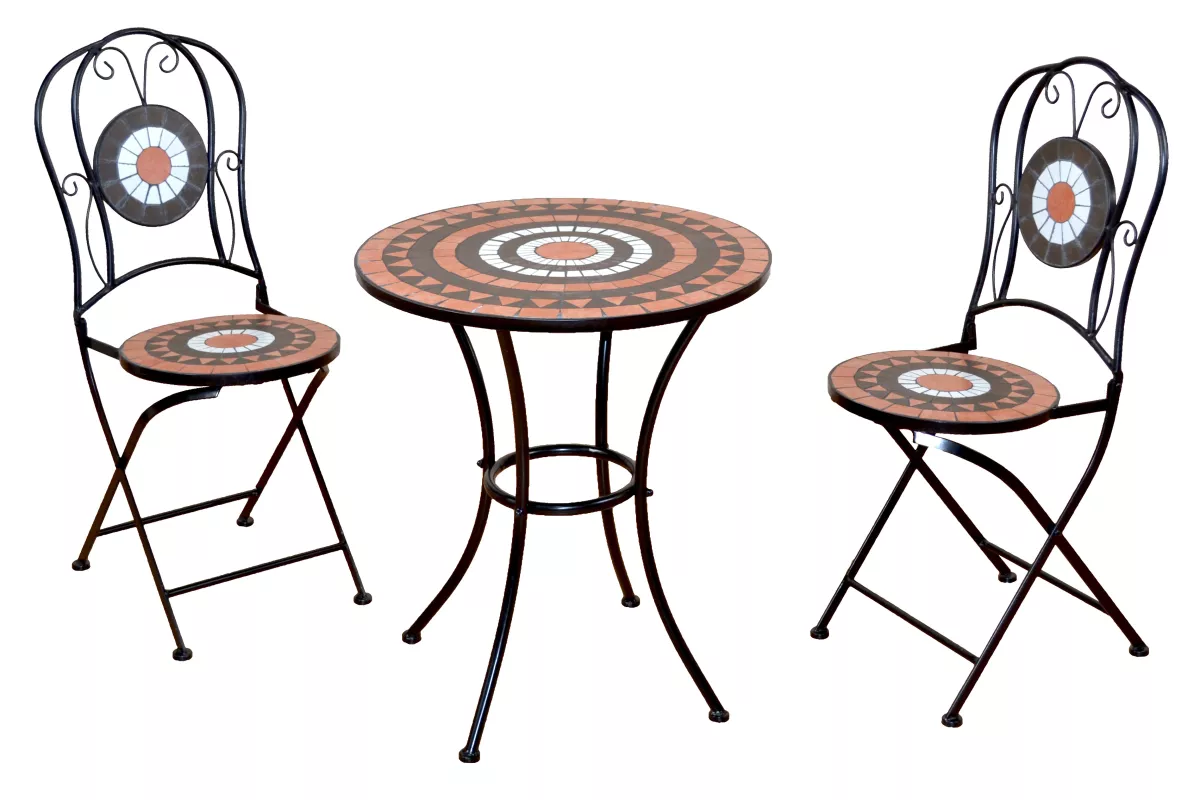Die aufwendig gestalteten Mosaikflächen in warmen Terra-, Braun- und Weißtönen machen diese Balkonmöbel zu einem echten Blickfang. Sowohl die Sitzflächen und Rückenlehnen der Stühle als auch die runde Tischplatte sind liebevoll mit dekorativen Mosaik-Stücken beklebt. Das harmonische Farbspiel sorgt für mediterranes Flair und eine besonders gemütliche Ausstrahlung.