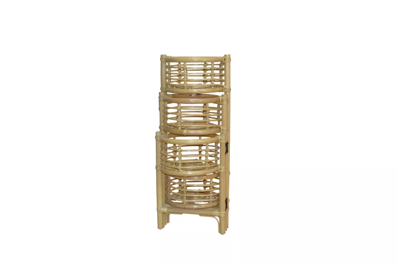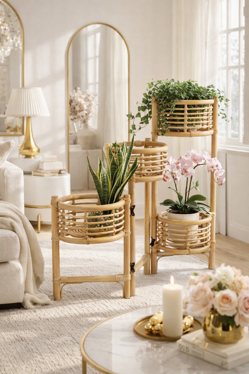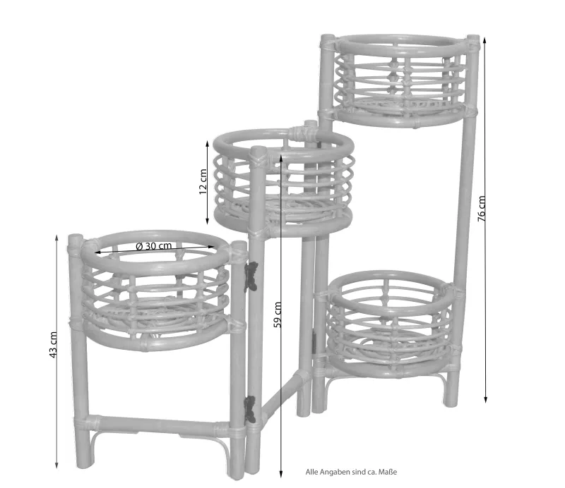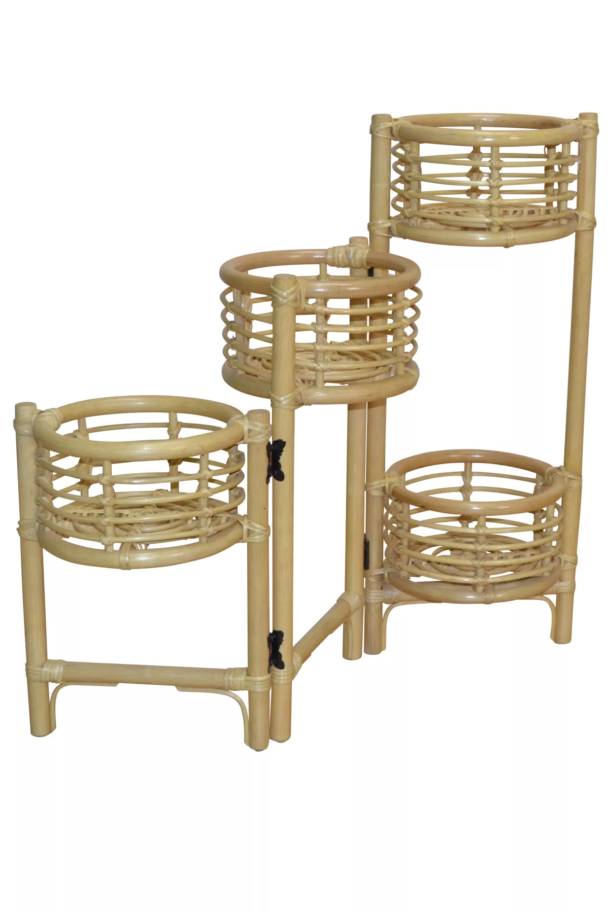 Blumenständer aus Rattanrohr, handgeflochten mit insgesamt 4 handgeflochtenen Blumentopf-Halterungen, Durchmesser je ca. 27 cm.