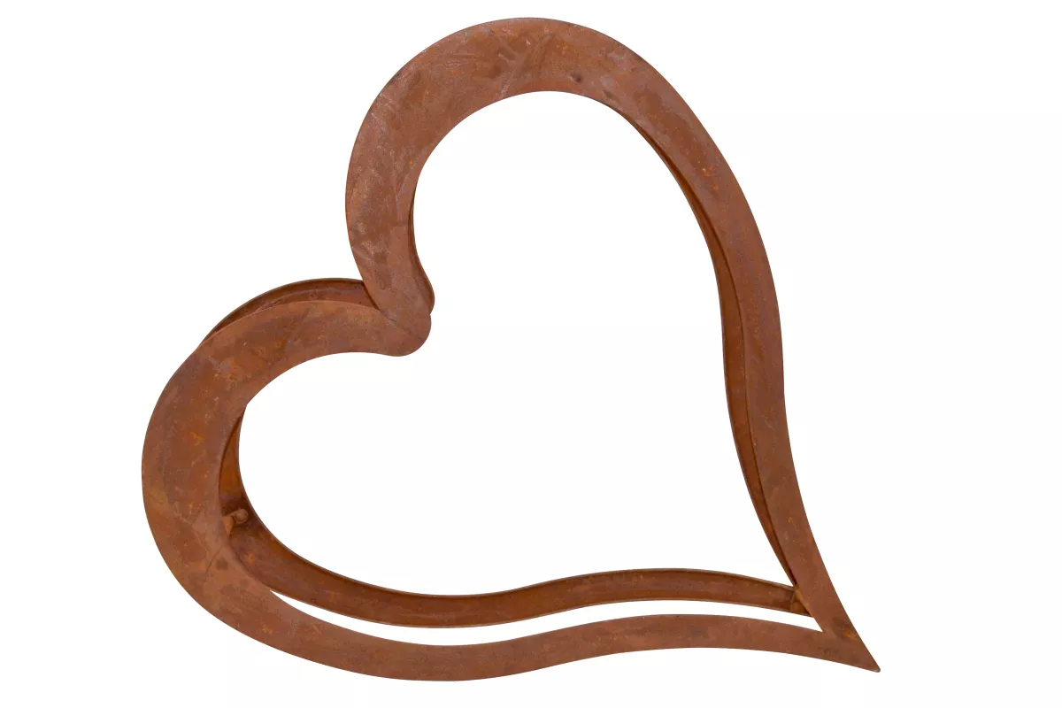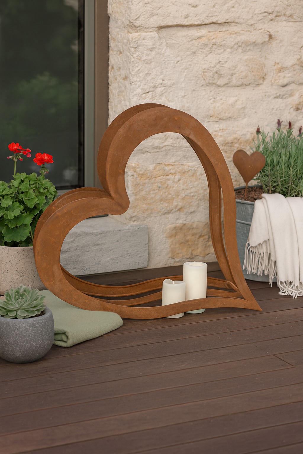 Dieses außergewöhnliche Metallregal in Herzform ist ein echter Blickfang für Haus und Garten. Gefertigt aus robustem Eisen mit einer natürlich rostigen Oberfläche, vereint es rustikalen Charme und moderne Deko-Ästhetik.