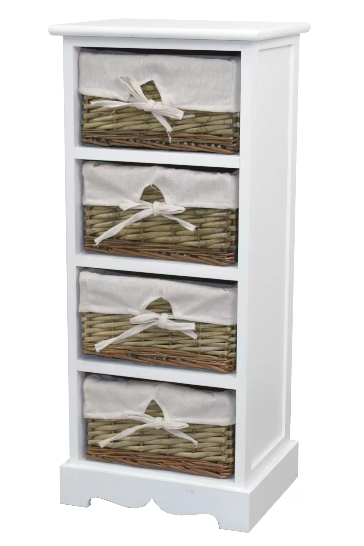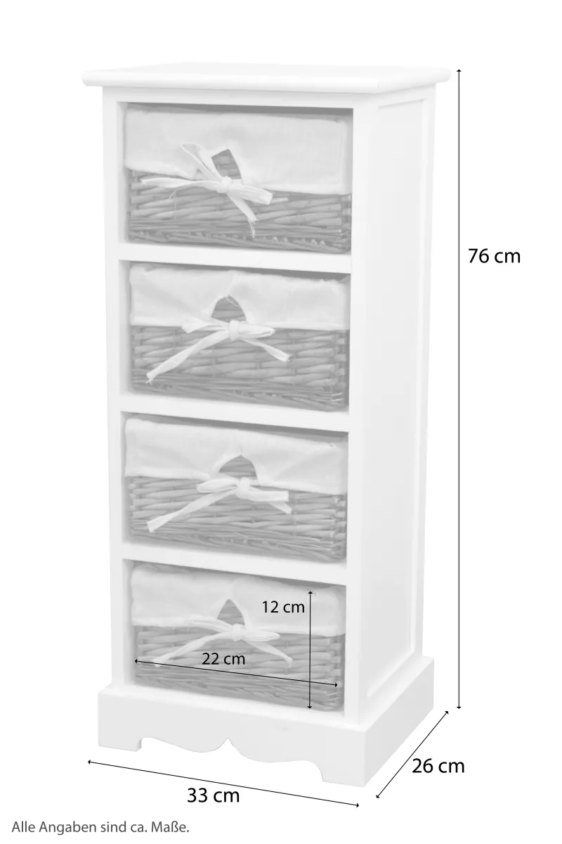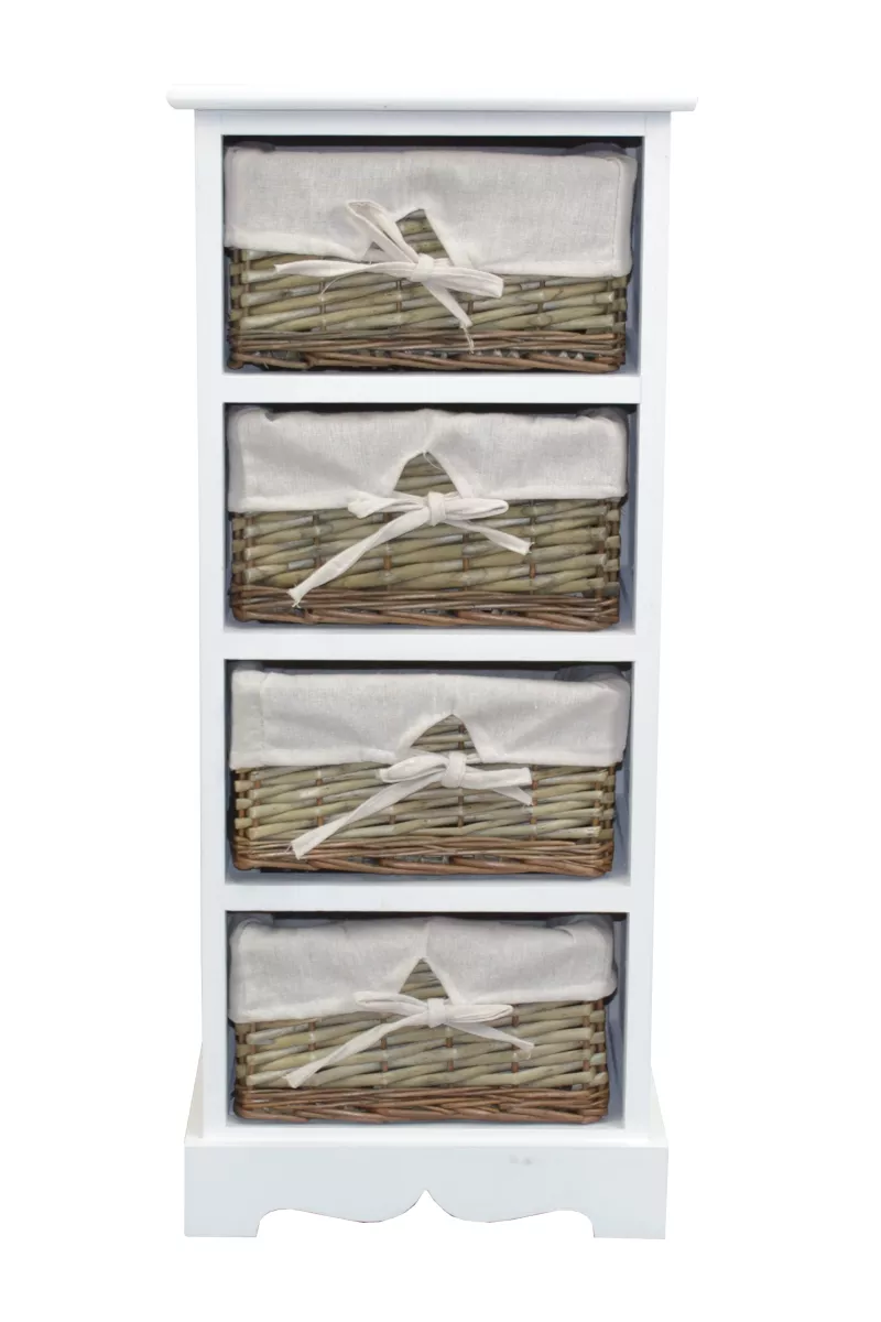 Vier handgeflochtene Weidenkörbe, naturgrau lackiert, bieten viel Stauraum für Accessoires, Wäsche, Kosmetik oder Dekoartikel. Die herausnehmbaren cremefarbenen Stoffeinsätze aus 100 % Polyester verleihen dem Regal eine warme, natürliche Optik und sorgen für Ordnung mit Stil.