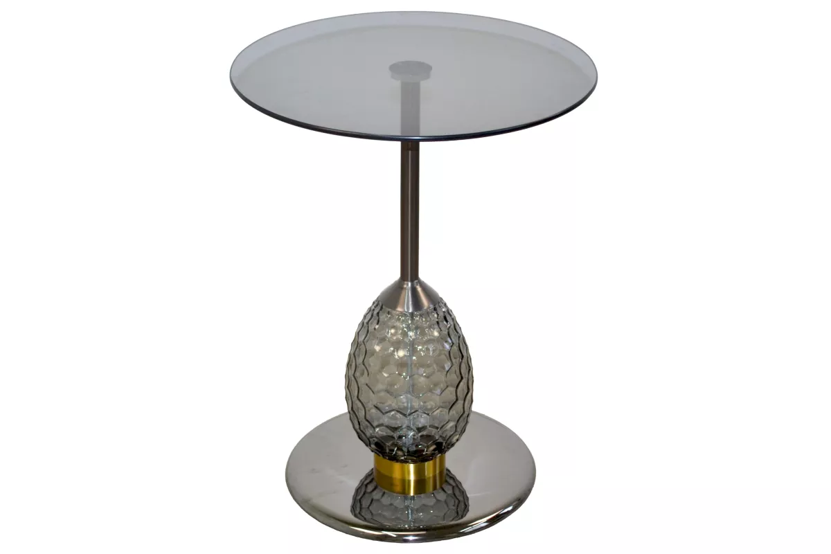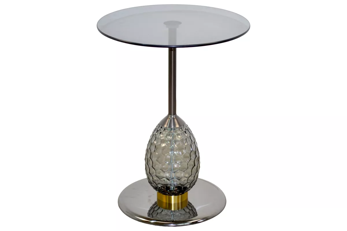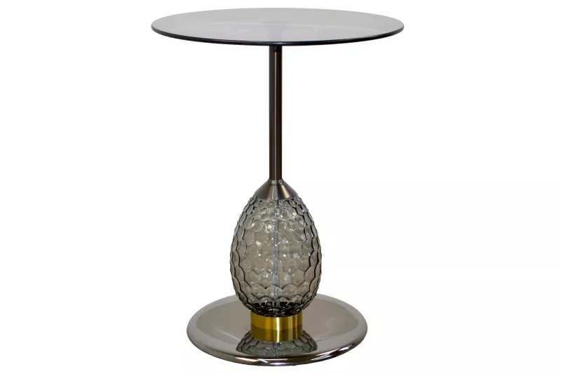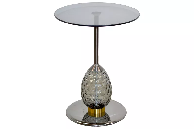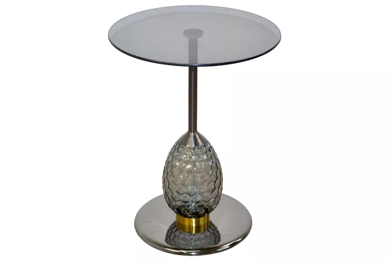 Das Gestell aus geformtem Glas und Metall schafft einen spannenden Materialmix, der gleichzeitig leicht und stabil wirkt. Abgerundet wird das Design durch eine runde Sicherheits-Grauglasplatte, die nicht nur besonders elegant aussieht, sondern auch alltagstauglich und pflegeleicht ist.