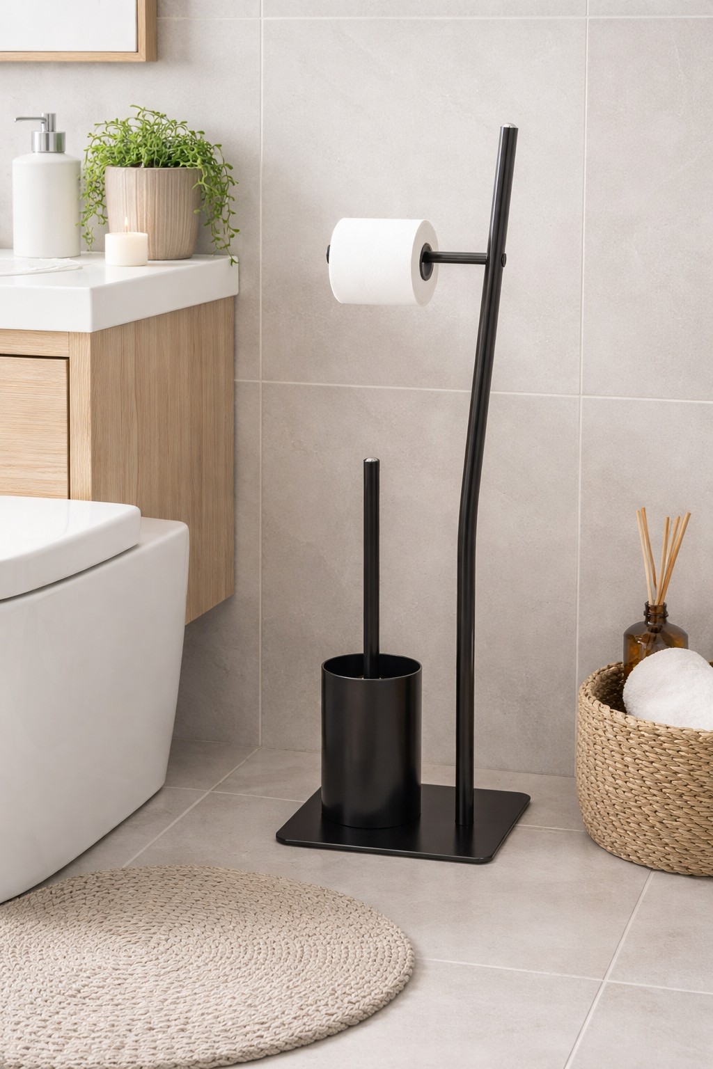 Diese moderne WC-Garnitur aus Metall vereint stilvolles Design mit praktischer Funktionalität und ist die perfekte Ergänzung für jedes Badezimmer oder Gäste-WC. Die hochwertige Oberfläche in schwarz matt pulverbeschichtet sorgt für eine elegante Optik und ist gleichzeitig robust, langlebig und pflegeleicht.