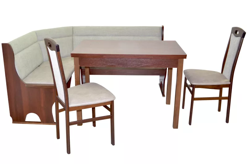 Gestell der Eckbank ist aus Holzwerkstoff (Melamin-Spanplatten) gefertigt und mit einem Melamin-Holzdekor, nussbaumfarben beschichtet.