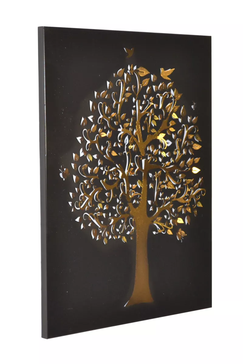 Edles Design: Goldfarbener Baum mit filigranen Ausstanzungen auf schwarzem Metall