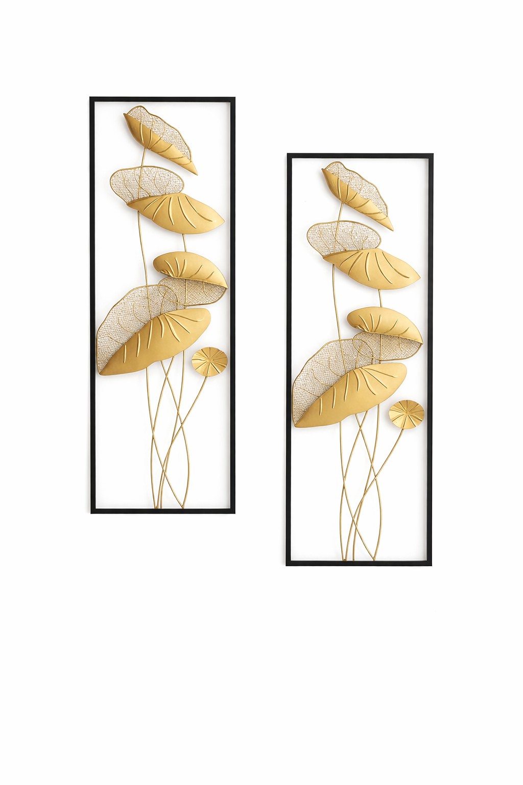 Diese stilvolle Wanddekoration aus Metall im praktischen 2er Set vereint modernes Design mit einem Hauch von Eleganz und wird zum echten Blickfang in jedem Wohnraum. Der schwarz beschichtete Rahmen bildet einen edlen Kontrast zu den kunstvoll eingearbeiteten Blättermotiven in antik goldfarbener Lackierung und sorgt für eine besonders hochwertige Ausstrahlung.