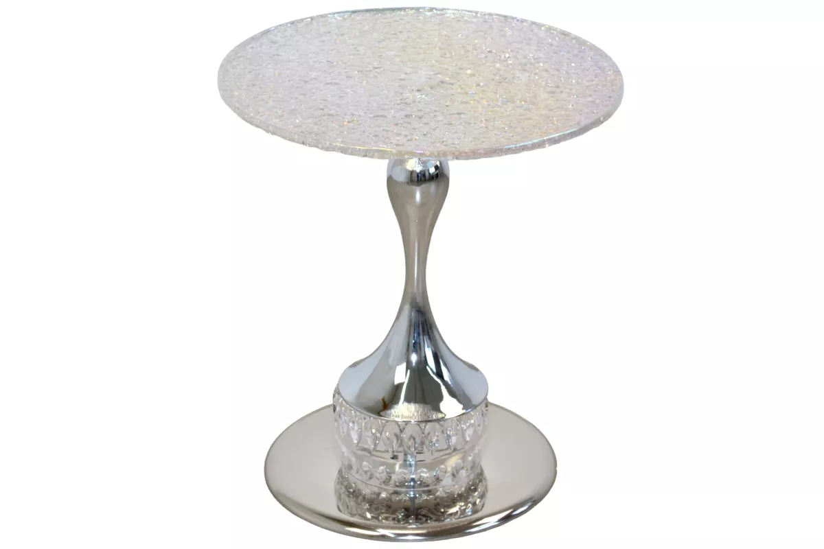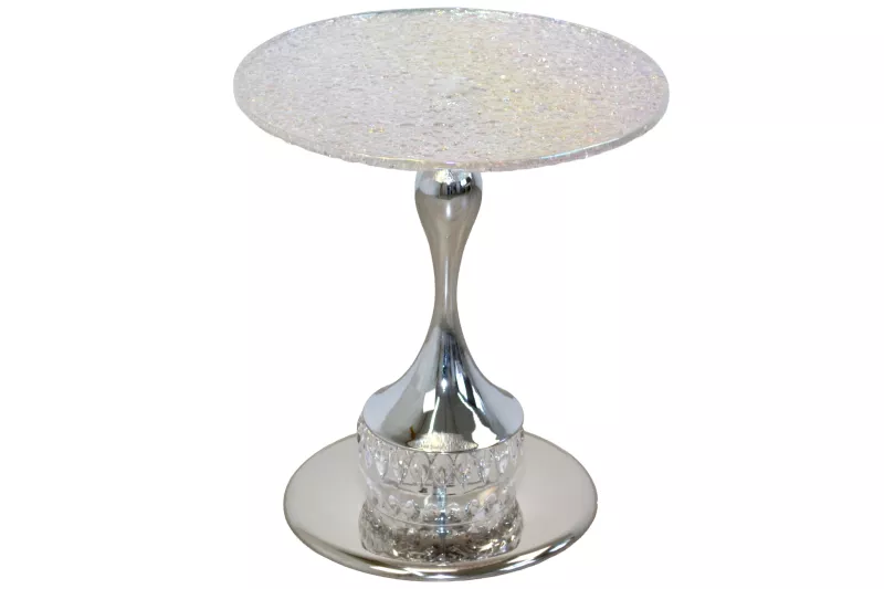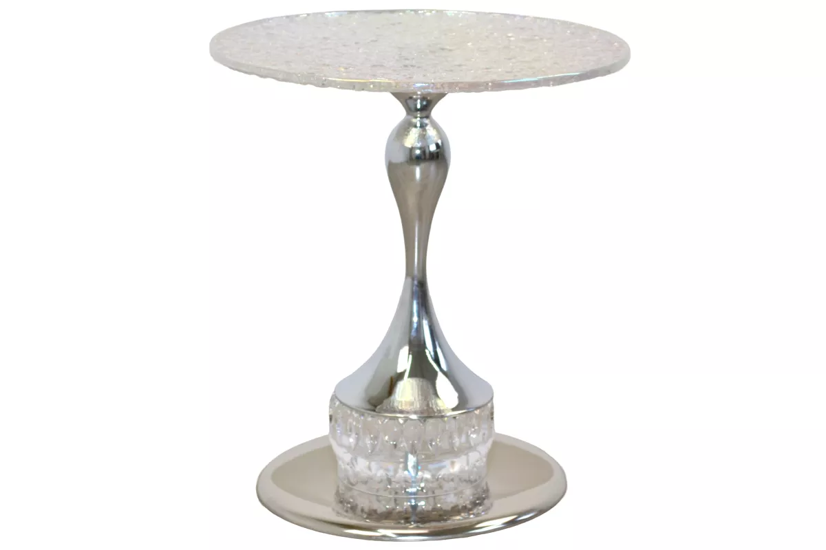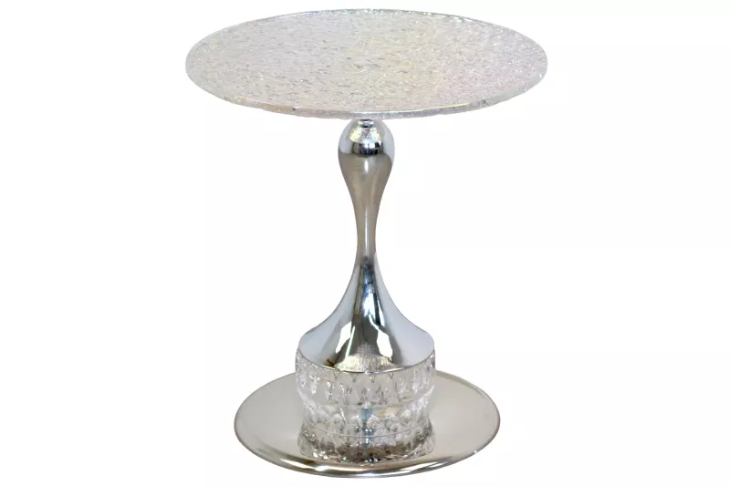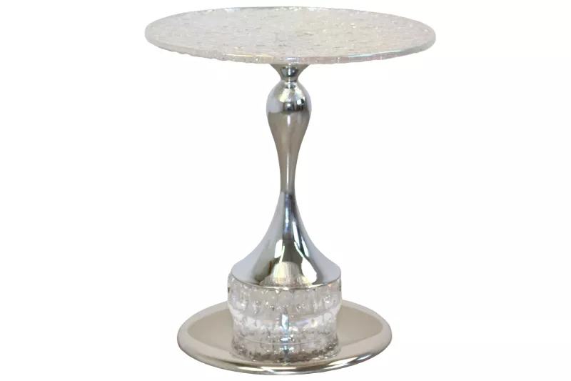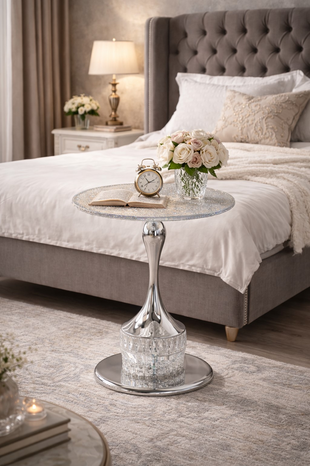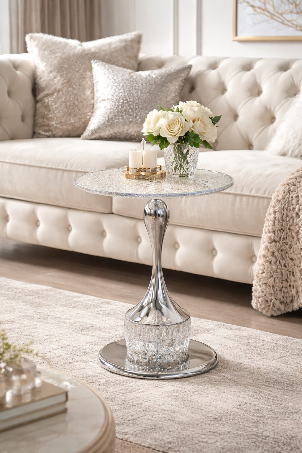 Abgerundet wird das Design durch chromfarbene Elemente, die dem Tisch einen modernen, kühlen und luxuriösen Charakter verleihen. Ob als stilvolle Ablage neben Sofa oder Sessel, als eleganter Dekotisch im Flur oder als glamouröses Highlight im Schlafzimmer – dieser Tisch passt sich jeder Umgebung ideal – und sorgt überall für ein hochwertiges Ambiente.