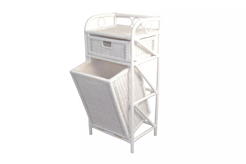 Das Regal bietet durchdachten Stauraum: Ein stabiler Ablageboden im oberen Bereich eignet sich ideal für Dekoration, Handtücher oder Pflegeprodukte. Darunter befindet sich ein praktischer Rattanschub, der zusätzlichen Platz für kleinere Utensilien schafft. Im unteren Bereich überzeugt ein großzügiger, aufklappbarer Wäschesammler, der mit einem cremefarbenen Wäschesack aus 100 % Polyester (PES) ausgestattet ist.