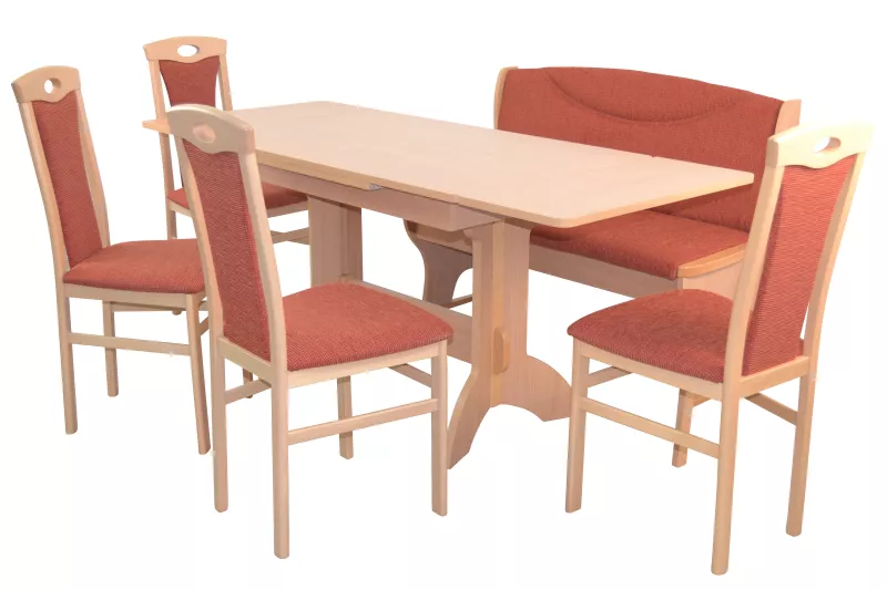 Rücken der Bank mit einer formstabilen Steppung gearbeitet. Das Gestell der Stühle ist aus Massivholz Buche gefertigt, buchefarben gebeizt und lackiert. Das Kopfteil der formschönen Rückenlehne ist mit einen praktischen Muschelgriff versehen.