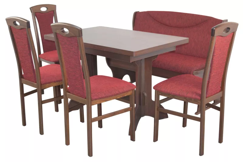 Rücken der Bank mit einer formstabilen Steppung gearbeitet. Das Gestell der Stühle ist aus Massivholz Buche gefertigt, nussbaumfarben gebeizt und lackiert. Das Kopfteil der formschönen Rückenlehne ist mit einen praktischen Muschelgriff versehen.