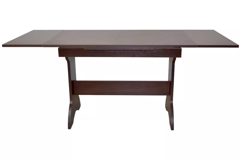 Gestell vom Tisch komplett aus Holzwerkstoff gefertigt und mit einem hochwertigen, strapazierfähigen Melamin-Holzdekor in Nussbaum, beschichtet. Unter der Tischplatte 110x70 cm sind rechts/links je eine Ansteckplatte (je ca. 30 cm breit) eingeschoben, die sich einfach und schnell herausziehen lassen. Dadurch ist der Tisch von 110 cm bis auf gesamt 170 cm ausziehbar. Alle Kanten sind mit einer hochwertigen ABS-Kante gearbeitet.