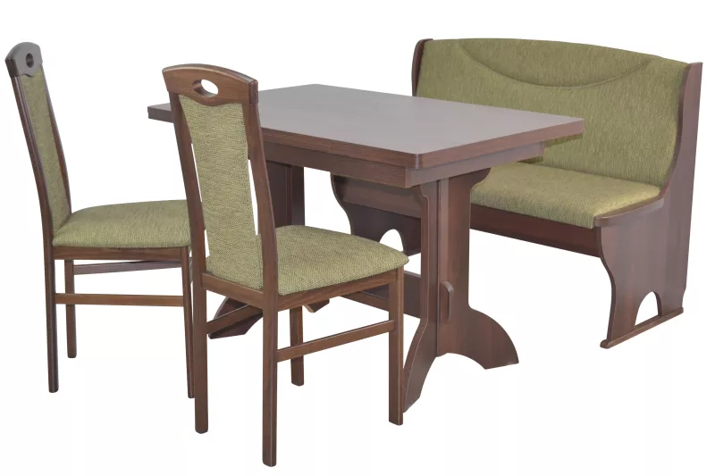 Die Sitz- und Rückenflächen der Bank und der Stühle sind bequem schaumstoffgepolstert und mit einem trendigen, strapazierfähigen Stoffbezug/Strukturstoff (43% Polyacryl/36% Polyester/21% Baumwolle) oliv farben bezogen.