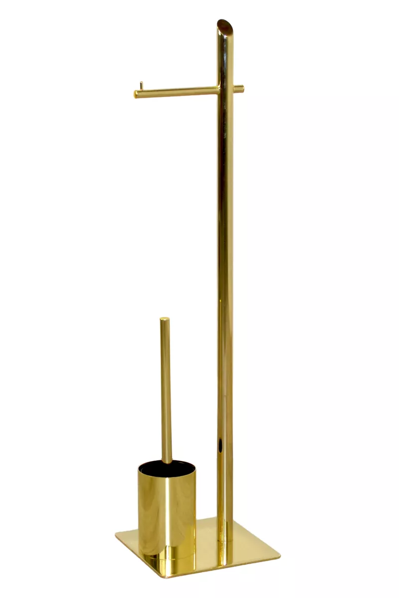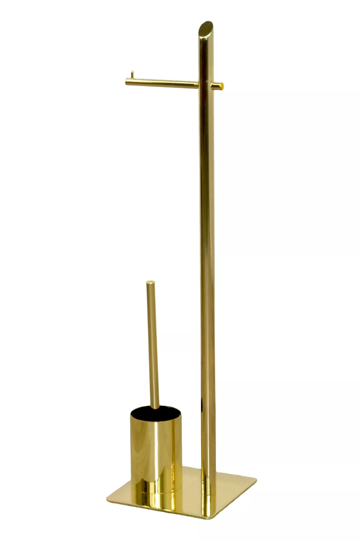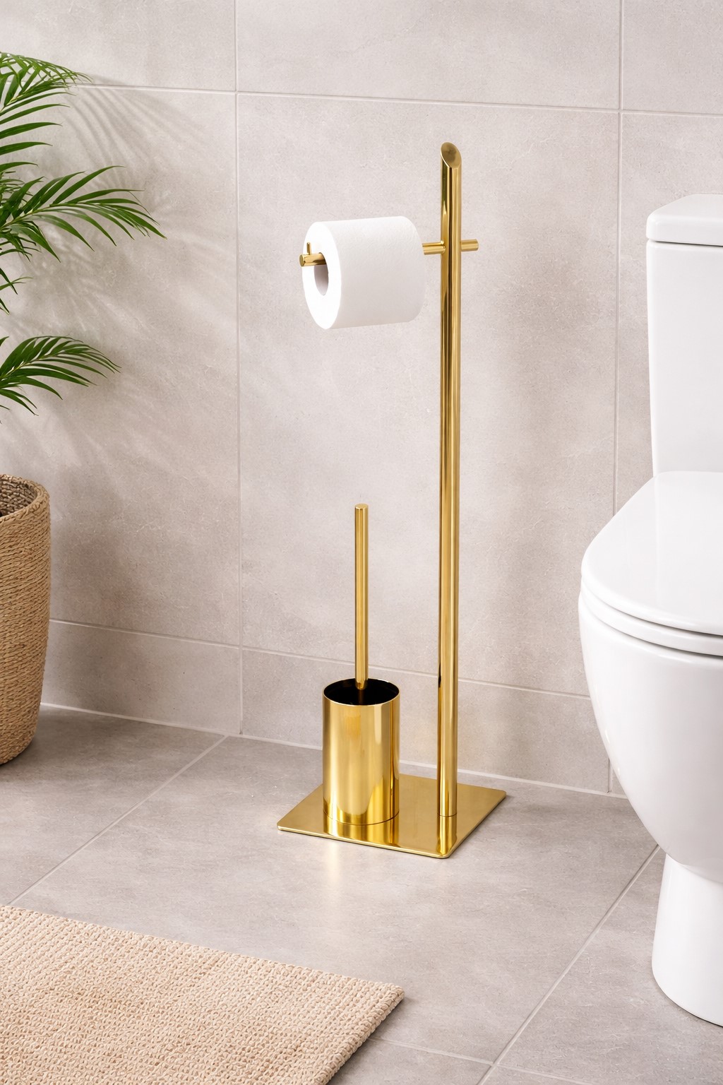 Diese elegante WC-Garnitur in edler Messingoptik vereint stilvolles Design mit maximaler Funktionalität. Die Kombination aus Toilettenpapierhalter und WC-Bürstenhalter sorgt für Ordnung im Badezimmer und ist dank ihrer schlanken Bauweise besonders platzsparend – ideal für moderne Bäder und Gäste-WCs.