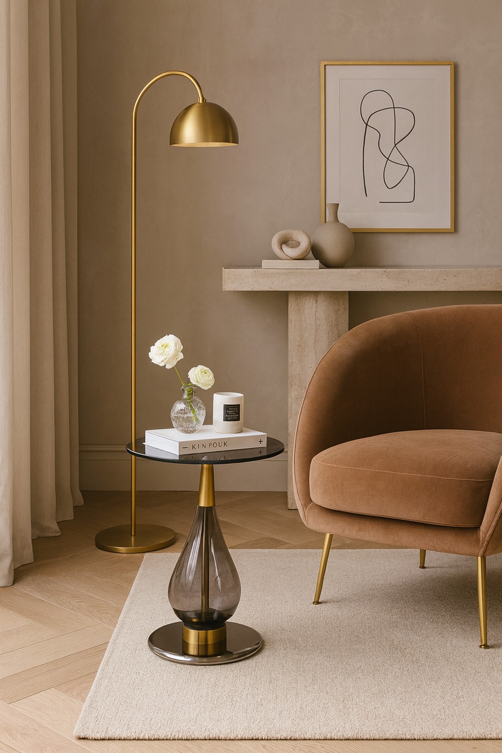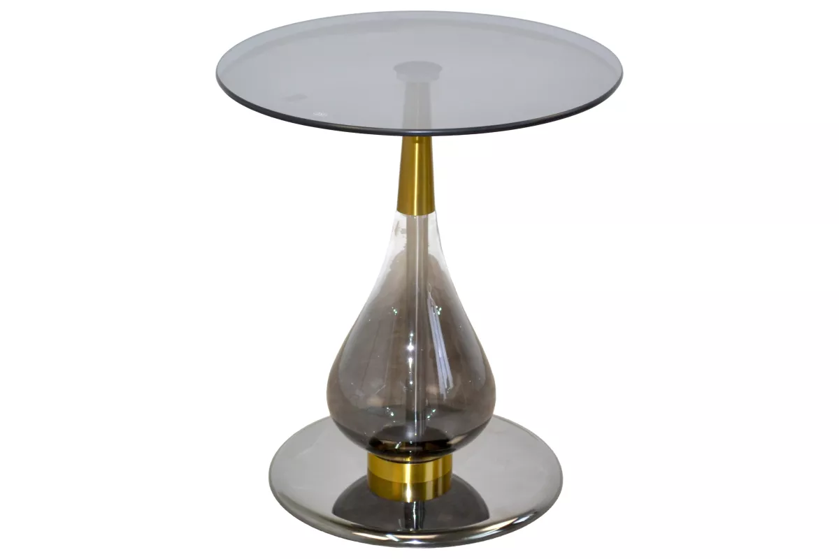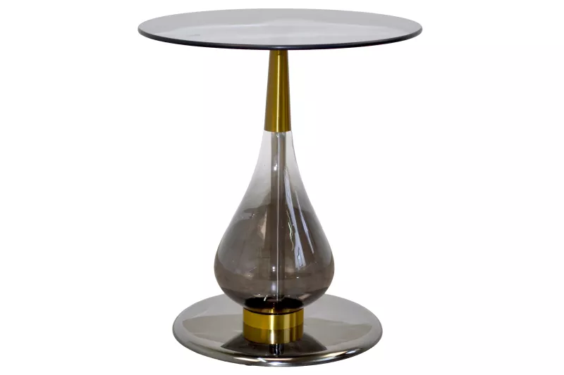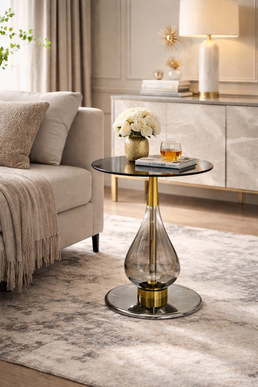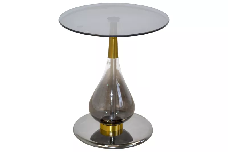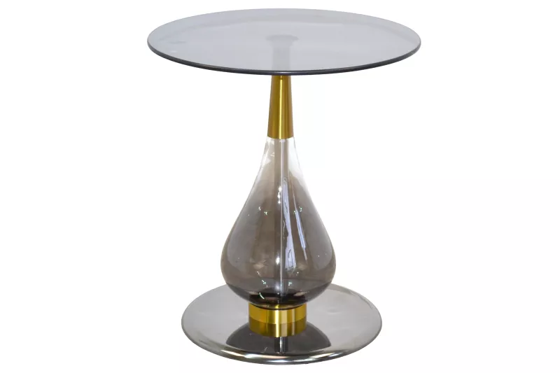 Das Gestell besteht aus geformtem Glas und Metall, wodurch ein spannender Materialmix entsteht, der Leichtigkeit und Stabilität perfekt verbindet. Die runde Sicherheitsglasplatte in Grau rundet das Design harmonisch ab und macht den Tisch gleichzeitig besonders alltagstauglich und pflegeleicht.