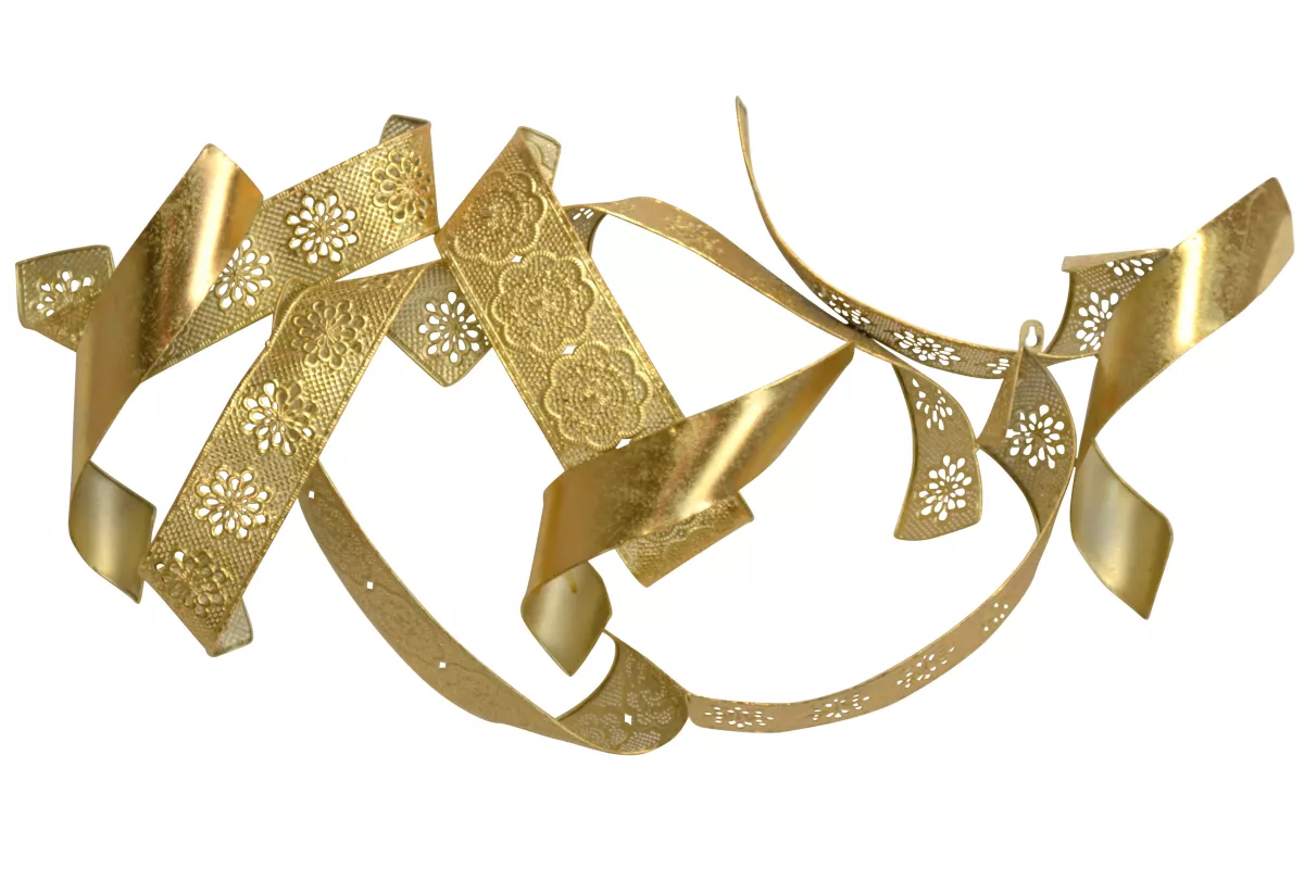 Diese wunderschöne Wanddekoration aus Metall ist ein echtes Highlight für jeden Wohnraum. Die ineinander geschwungenen, verdrehten Streifen schaffen eine elegante, moderne Dynamik, während die unterschiedlichen Oberflächenstrukturen faszinierende Lichtreflexe erzeugen. Die edle goldfarbene Lackierung verleiht dem Kunstobjekt eine luxuriöse Note und macht es zum stilvollen Blickfang über Sofa, Sideboard oder im Flur.