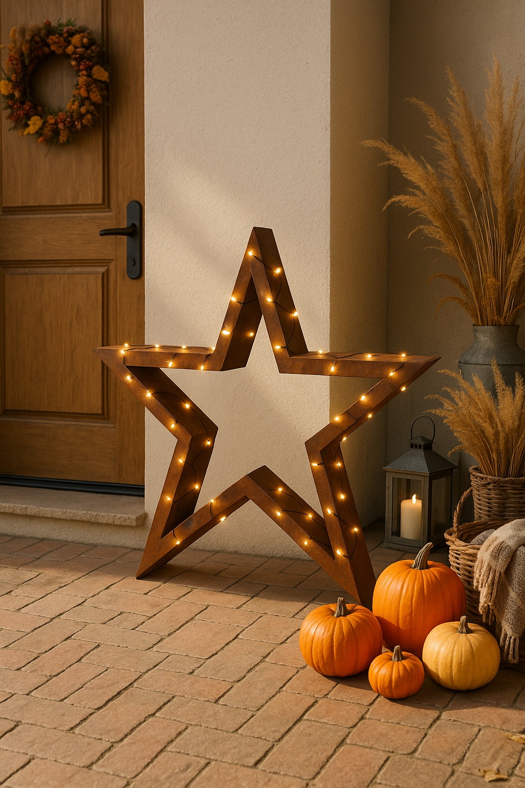 Platzieren Sie den großen Stern auf dem Boden neben dem Kamin, auf der Terrasse oder im Eingangsbereich. Mit etwas Beleuchtung entsteht ein gemütliches, stimmungsvolles Ambiente – perfekt für Herbst und Winter.