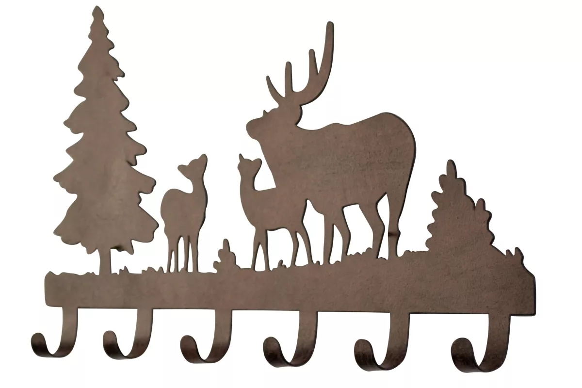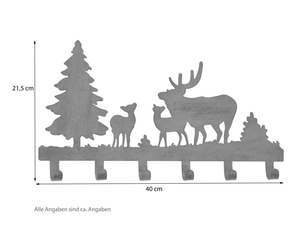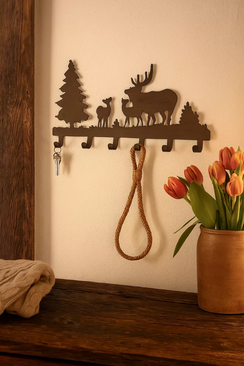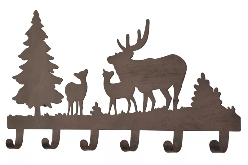 Die Metall-Garderobenleiste „Waldidylle“ in edlem Braunton bringt den Zauber der Natur direkt in Ihr Zuhause. Das liebevoll gestaltete Waldmotiv mit Hirschen und Tannen verleiht jedem Raum ein Gefühl von Ruhe und Natürlichkeit – perfekt für den Landhausstil oder ein rustikales Wohnambiente.