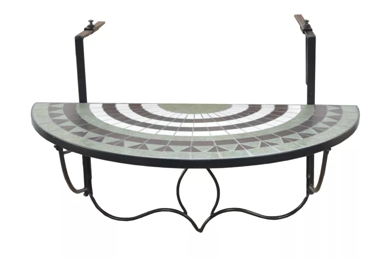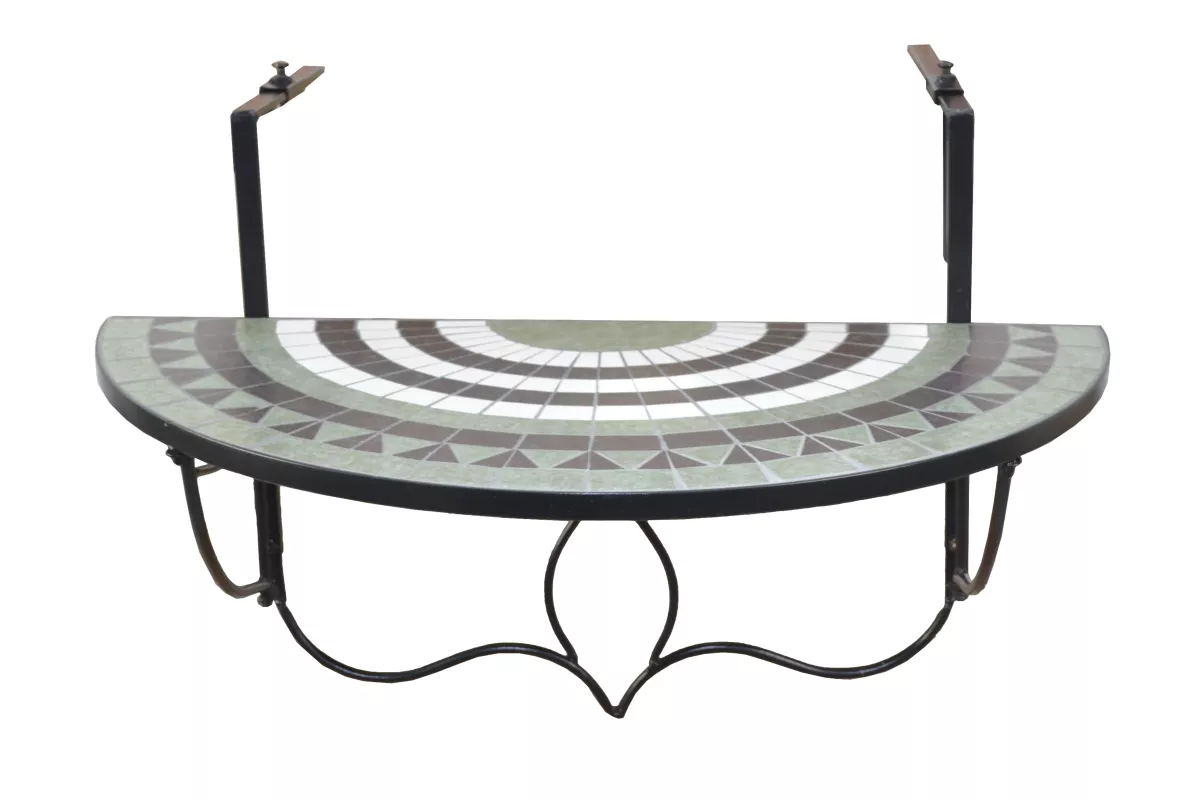 Das stabile schwarz beschichtete Eisengestell sorgt für sicheren Halt und eine elegante Optik. Die halbrunde Tischplatte ist von einem umlaufenden Eisenrahmen eingefasst und mit liebevoll eingeklebten Mosaikstücken in harmonischen Grüntönen verziert. Das dekorative Metallornament unter der Tischplatte (ca. 29 cm hoch) verleiht dem Tisch zusätzlichen Charme im mediterranen Stil.