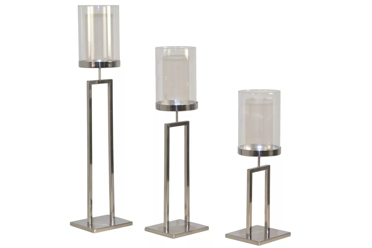 Bringen Sie stilvolle Eleganz in Ihr Zuhause mit diesem 3-teiligen Kerzenständer-Set im modernen Design. Die Kombination aus hochwertig verchromtem Metall und klaren Glaszylindern macht dieses Set zu einem echten Blickfang auf jedem Sideboard, Tisch oder Fensterbrett.