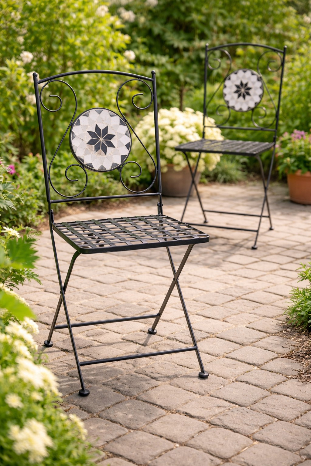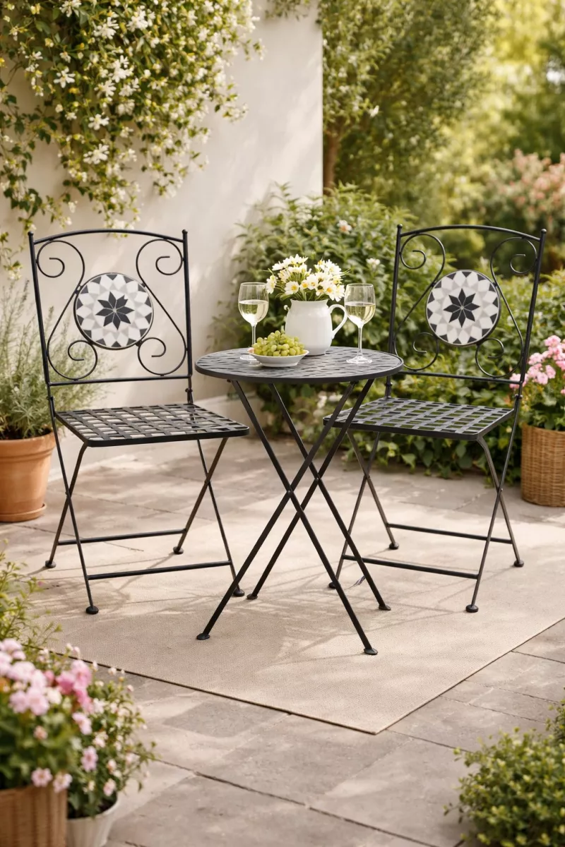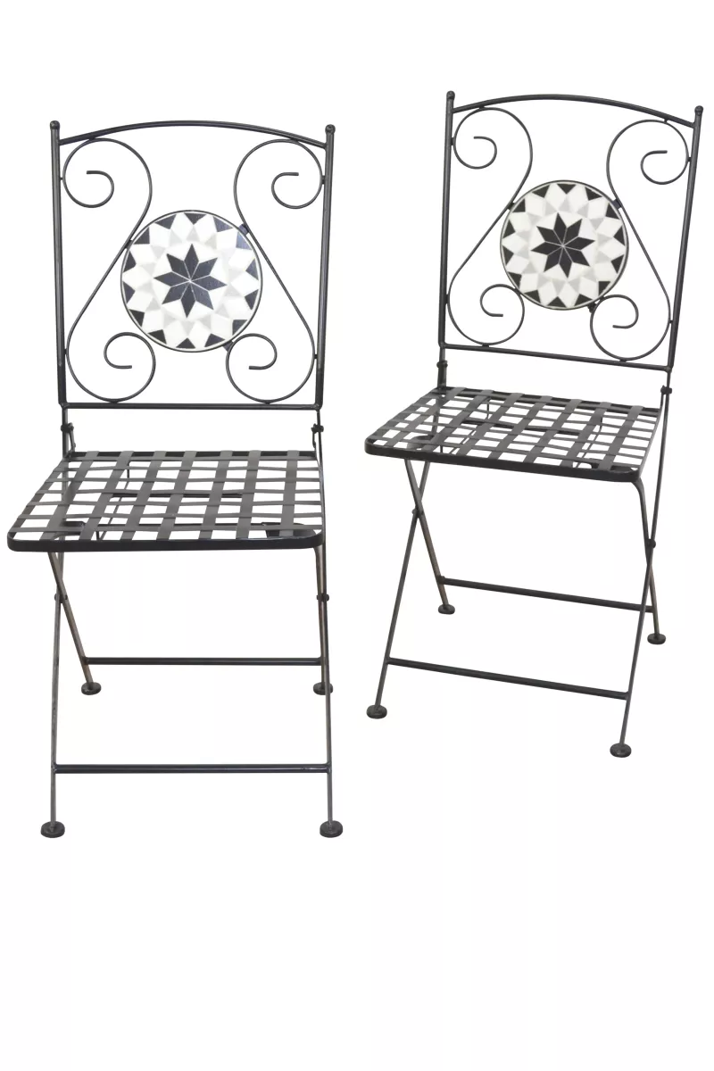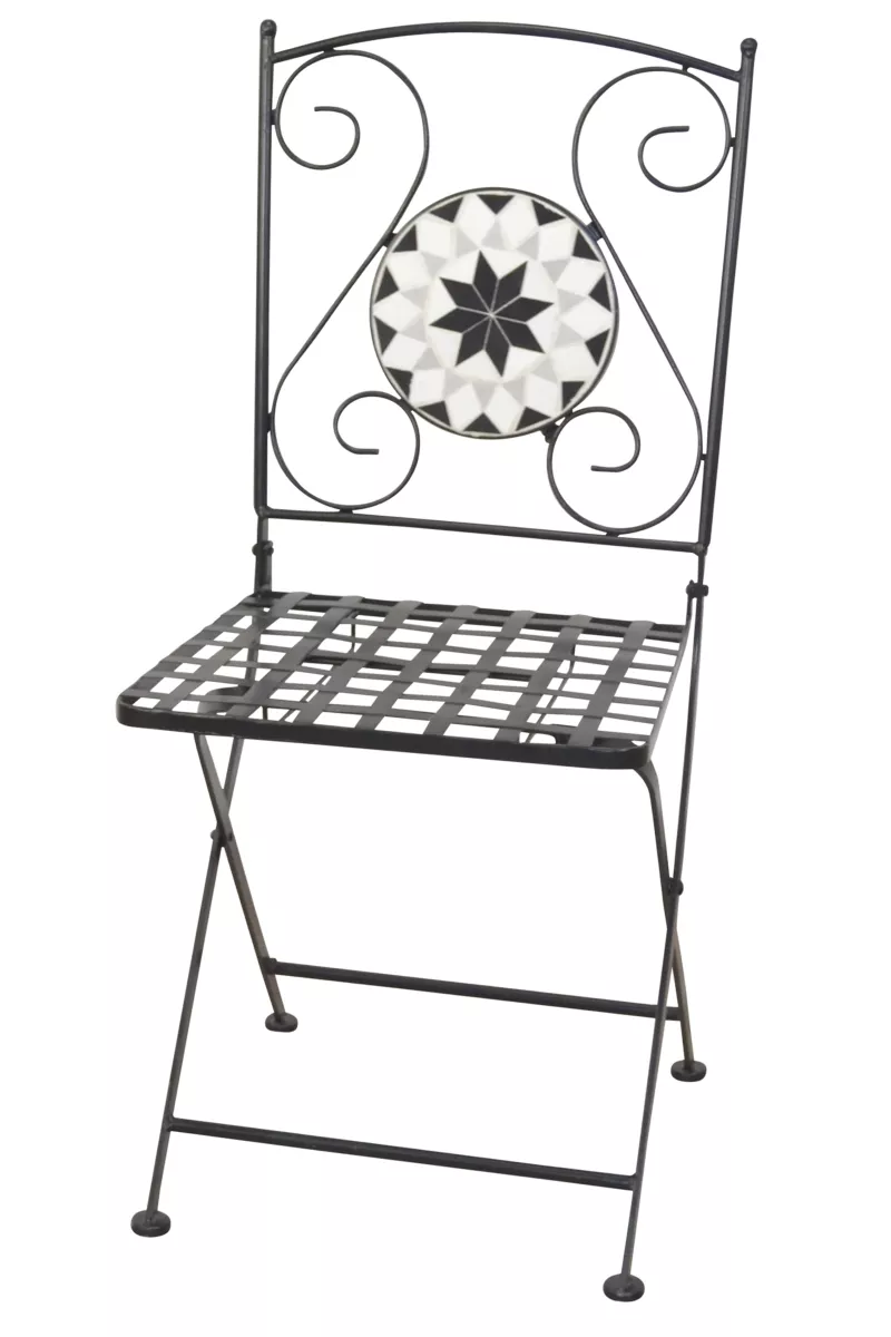 Die eleganten und wunderschönen Gartenstühle „Bamberg“ aus Eisen sind ein stilvoller Blickfang für Ihre Terrasse, Ihren Balkon oder Ihren Garten. Mit ihrem dekorativen schwarz-weißen Mosaik im Rückenbereich vereinen sie klassisches Design mit mediterranem Flair und setzen geschmackvolle Akzente in jedem Outdoor-Bereich.