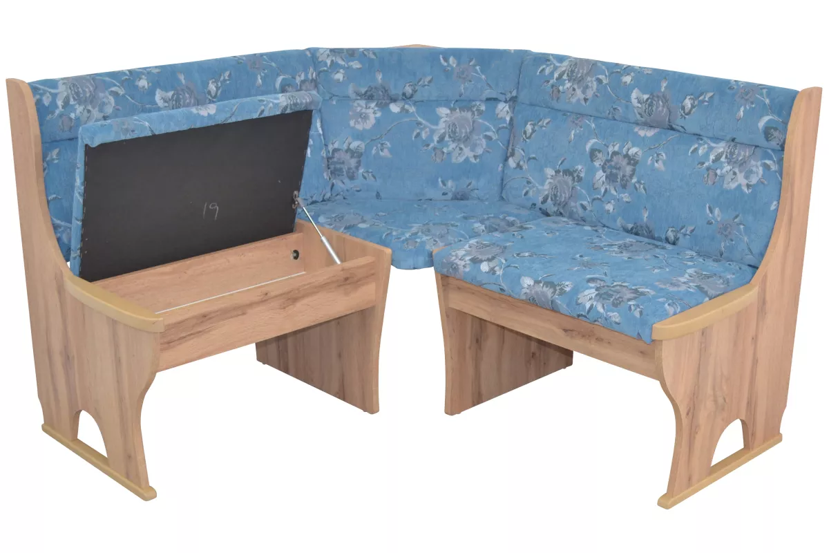 Eckbank (Stellmaß 125x125 cm) mit attraktiven Stoffbezug im Blumendessin bezogen. Die Eckbank ist aus hochwertigen Holzwerkstoff gefertigt und mit einem pflegeleichten Melamindekor in Eiche-Nachbildung, beschichtet. Unter den aufklappbaren Sitzflächen befindet sich viel Stauraum. Durch die hochwertigen Gasdruckfedern ist ein sicheres, langsames absenken der Klappen gewährleistet. Eckbank wird zur Selbstmontage, inklusive Aufbauanleitung angeliefert.
