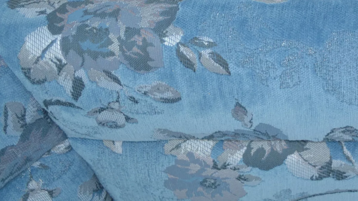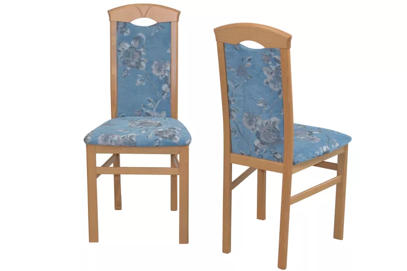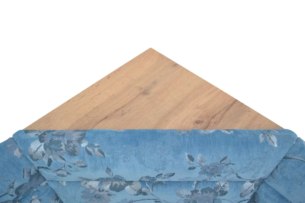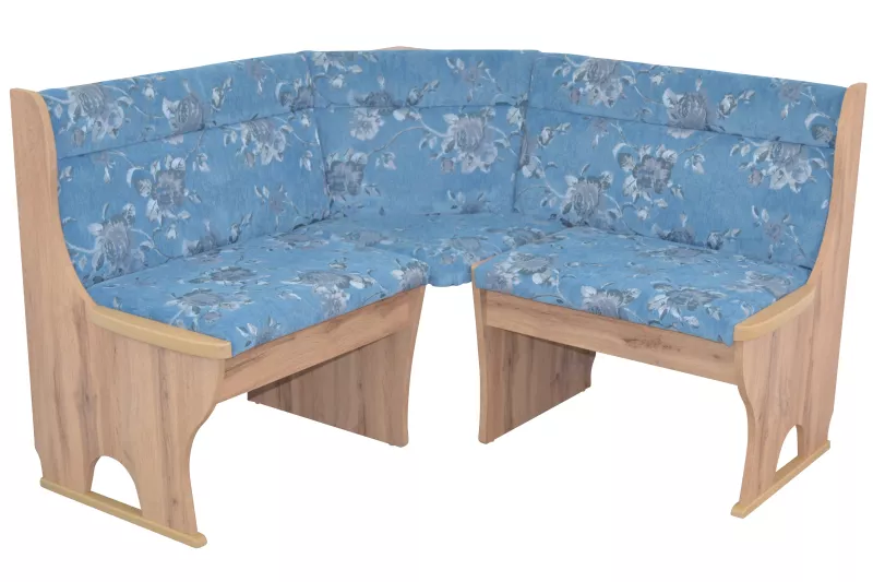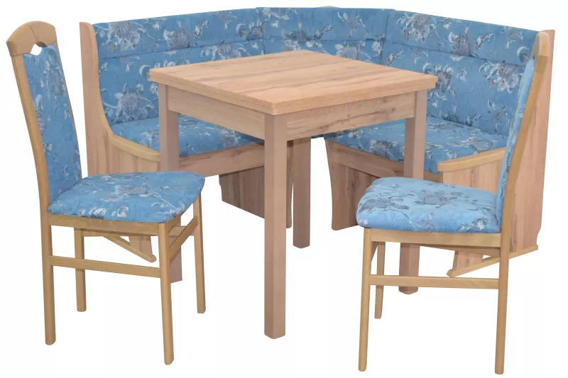 Sitzflächen und Rücken der Stühle und der Eckbank, sind bequem schaumstoffgepolstert und mit einem attraktiven Stoffebezug (100% Polyester) blau mit Blumenmotiv, bezogen.