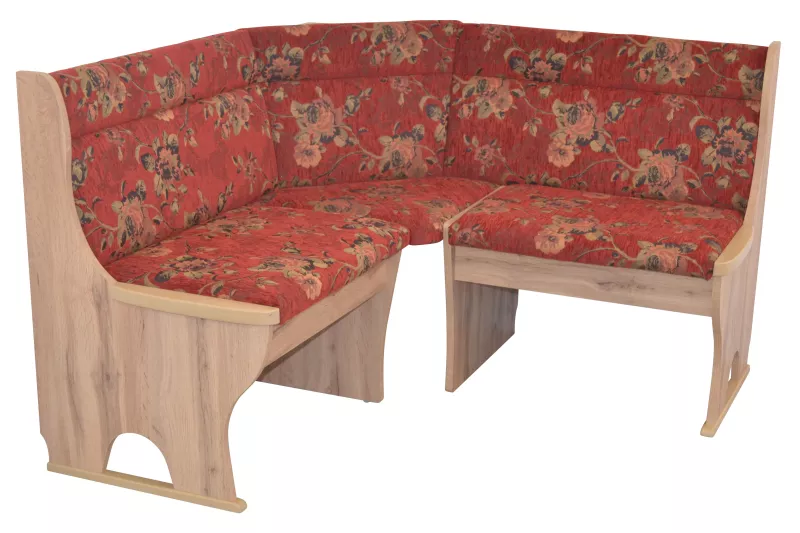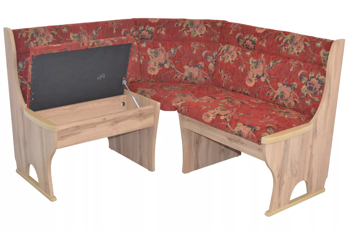Eckbank (Stellmaß 125x125 cm) mit attraktiven Stoffbezug im Blumendessin bezogen. Die Eckbank ist aus hochwertigen Holzwerkstoff gefertigt und mit einem pflegeleichten Melamindekor in Eiche-Nachbildung, beschichtet. Unter den aufklappbaren Sitzflächen befindet sich viel Stauraum. Durch die hochwertigen Gasdruckfedern ist ein sicheres, langsames absenken der Klappen gewährleistet. Eckbank wird zur Selbstmontage, inklusive Aufbauanleitung angeliefert.