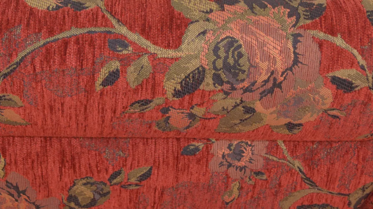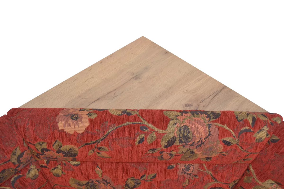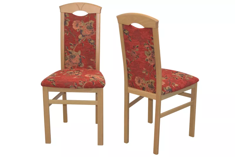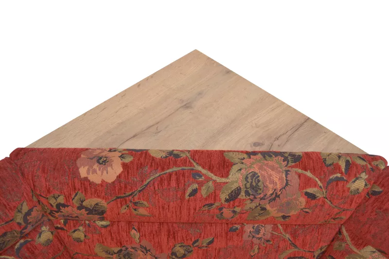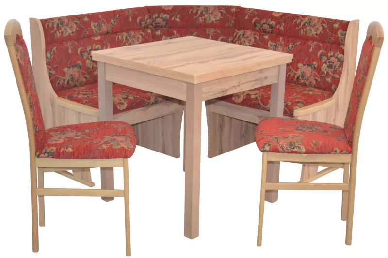 Sitzflächen und Rücken der Stühle und der Eckbank, sind bequem schaumstoffgepolstert und mit einem attraktiven Stoffebezug (100% Polyester) rot mit Blumenmotiv, bezogen.