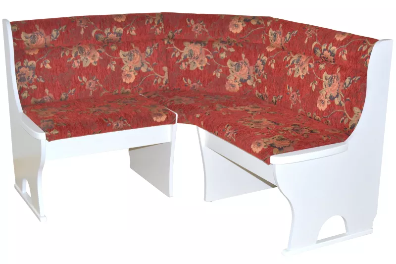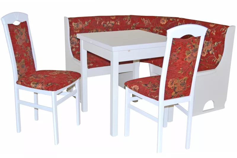Sitzflächen und Rücken der Stühle und der Eckbank, sind bequem schaumstoffgepolstert und mit einem attraktiven Stoffebezug (100% Polyester) rot mit Blumenmotiv, bezogen.