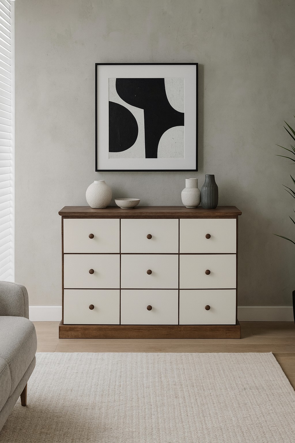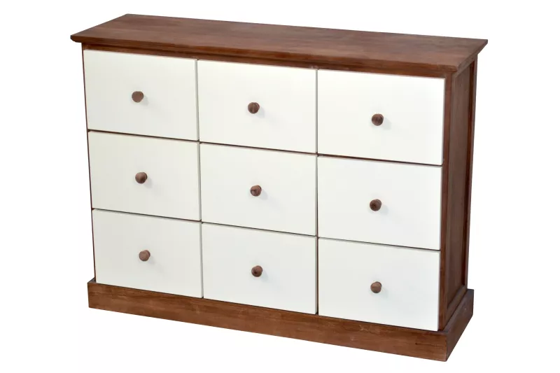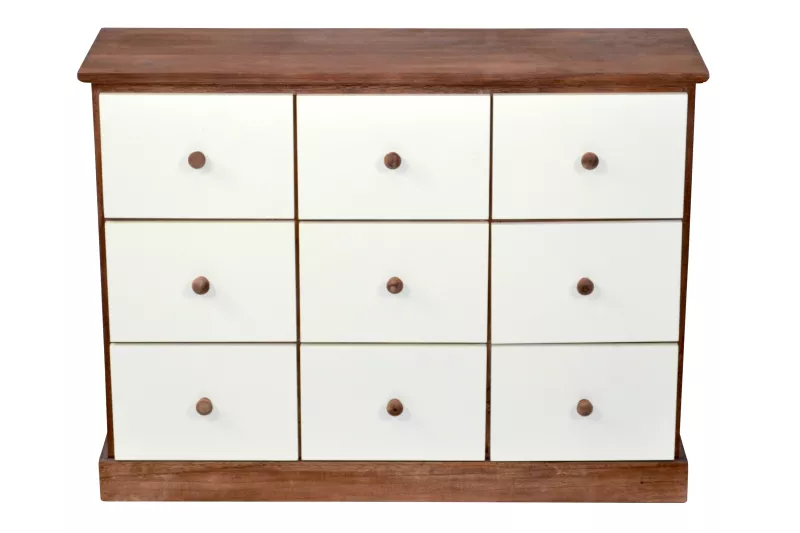 Mit neun geräumigen Schubladen bietet die Kommode viel Platz für Kleidung, Accessoires oder Alltagsgegenstände. Die Massivholz-Knöpfe unterstreichen den hochwertigen Look. Dank der komplett montierten Lieferung kann die Kommode sofort genutzt werden – einfach auspacken, aufstellen, fertig!