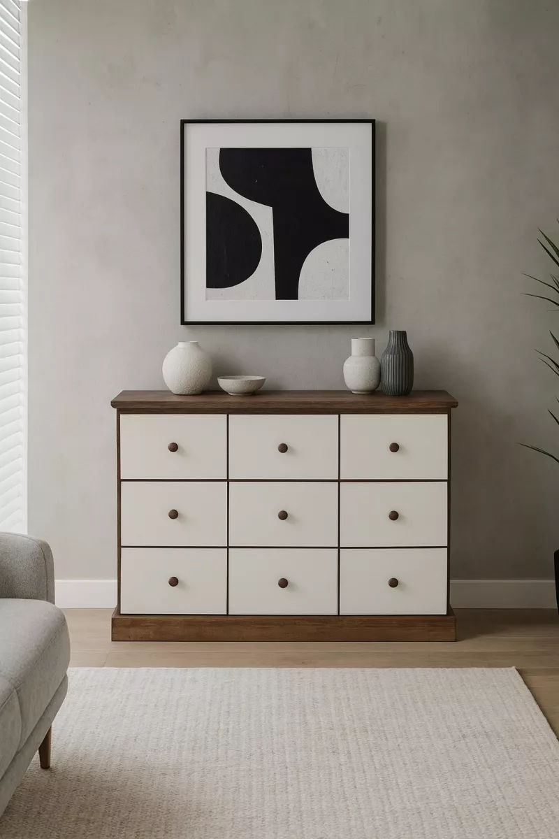 Diese elegante Kommode aus Massivholz verbindet modernes Design mit praktischer Funktionalität. Der Korpus aus Paulownia-Holz (Blauglockenbaum) überzeugt durch seine natürliche Maserung und warme nussbaumfarbene Beize, die ein gemütliches Wohnambiente schafft. Die Schubkastenfronten aus MDF in cremweißem Lack sorgen für einen edlen Kontrast und fügen sich harmonisch in verschiedenste Einrichtungsstile ein – ob modern, skandinavisch oder klassisch.