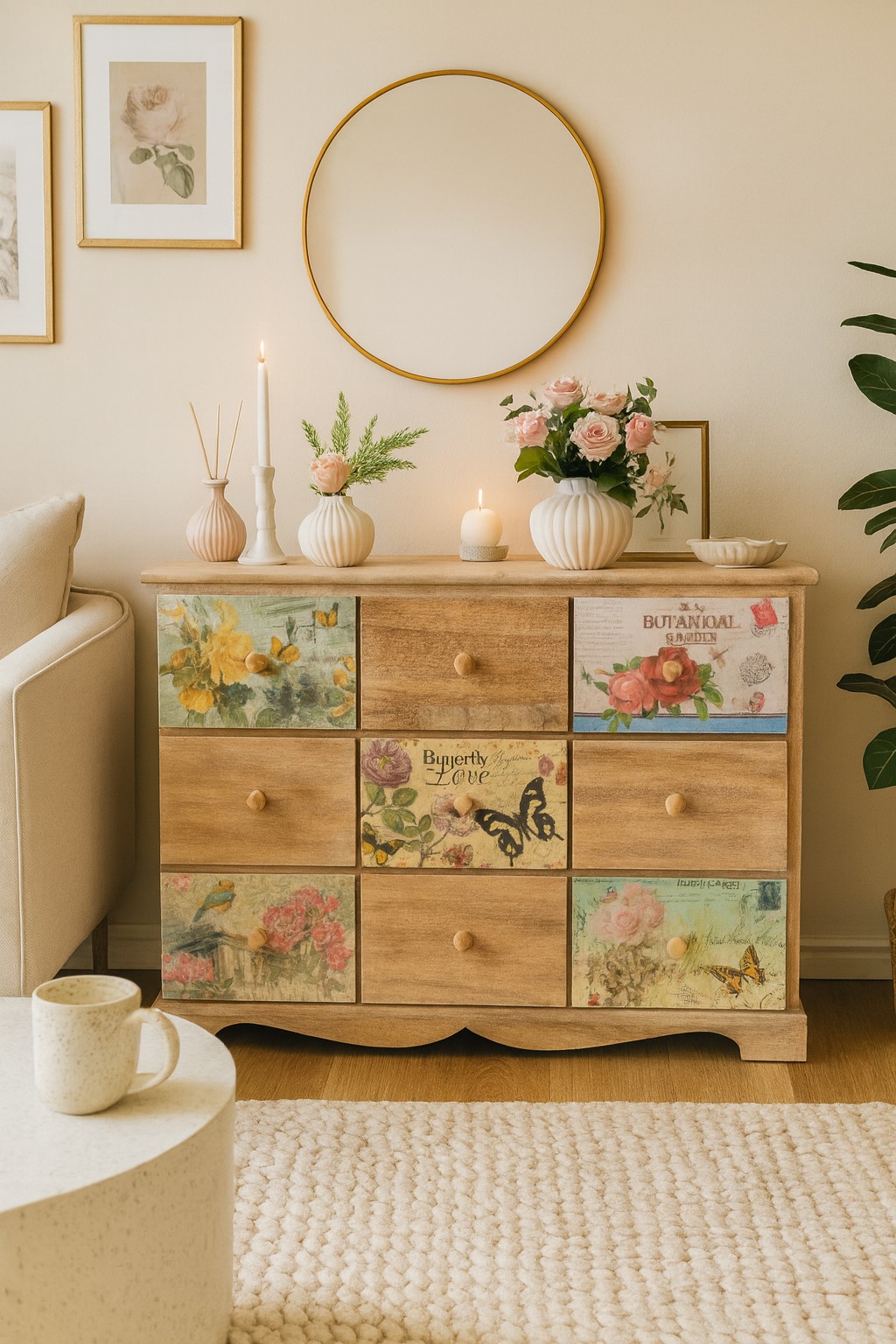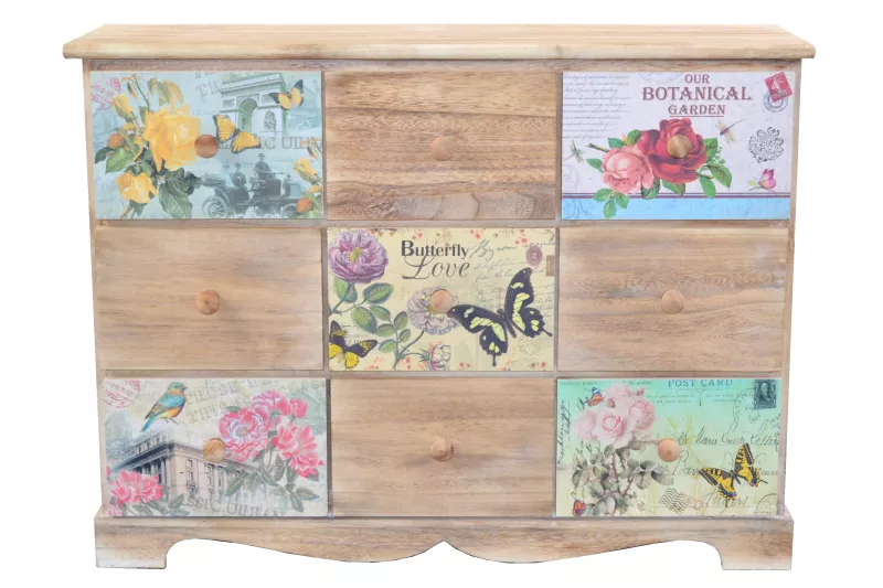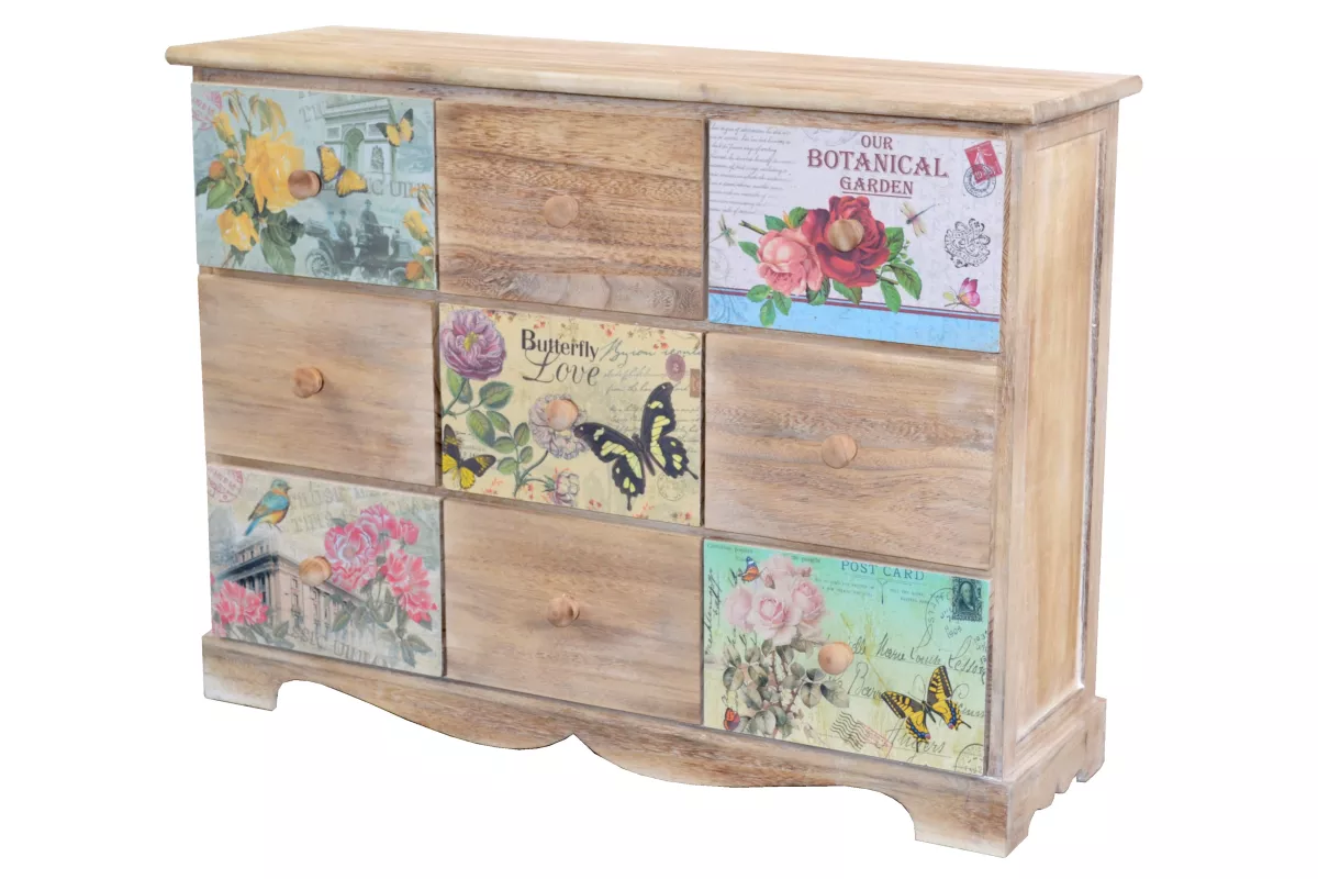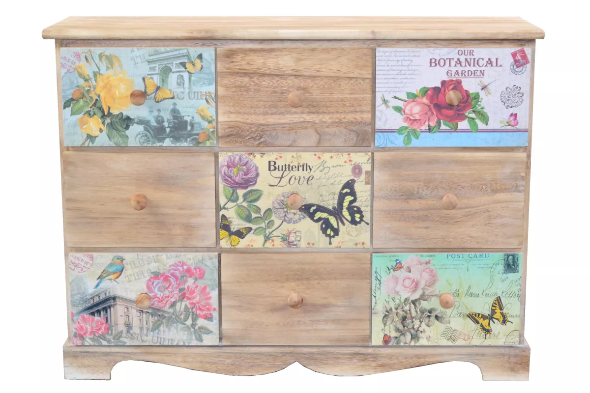 Diese Kommode mit Schubladen ist mehr als nur ein Aufbewahrungsmöbel – sie ist ein Design-Highlight! Durch die Kombination aus Naturholz-Optik und verspielten Motiven bringt sie Frische, Farbe und Individualität in Ihr Zuhause. Ideal für Wohnzimmer, Schlafzimmer, Flur oder Kinderzimmer.