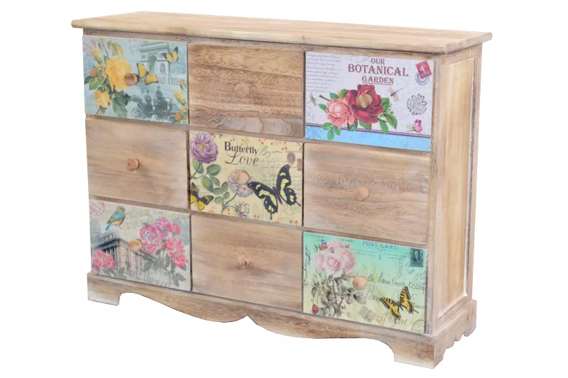 Diese funktionelle Kommode mit 9 Schubkästen vereint praktische Aufbewahrung mit kreativem Design. Gefertigt aus hochwertigem Massivholz Blauglockenbaum und robustem MDF, überzeugt das Möbelstück durch Stabilität, Langlebigkeit und natürlichen Charme. Der naturfarbene Korpus mit fein herausgearbeiteter Holzstruktur und lackierter Oberfläche bringt Wärme und Natürlichkeit in jeden Raum.
