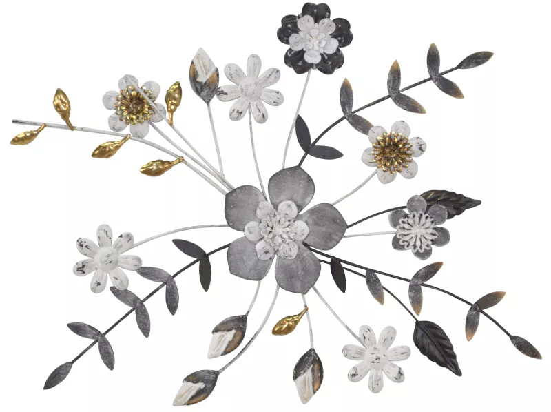 Verleihen Sie Ihrem Zuhause einen Hauch von Eleganz mit dieser wunderschönen Wanddekoration aus Metall im modernen 3D-Stil. Das kunstvolle Motiv aus zarten Blüten und filigranen Blättern in edlen Farbtönen von Grau, Creme und Gold sorgt für ein stilvolles Ambiente und zieht garantiert alle Blicke auf sich.