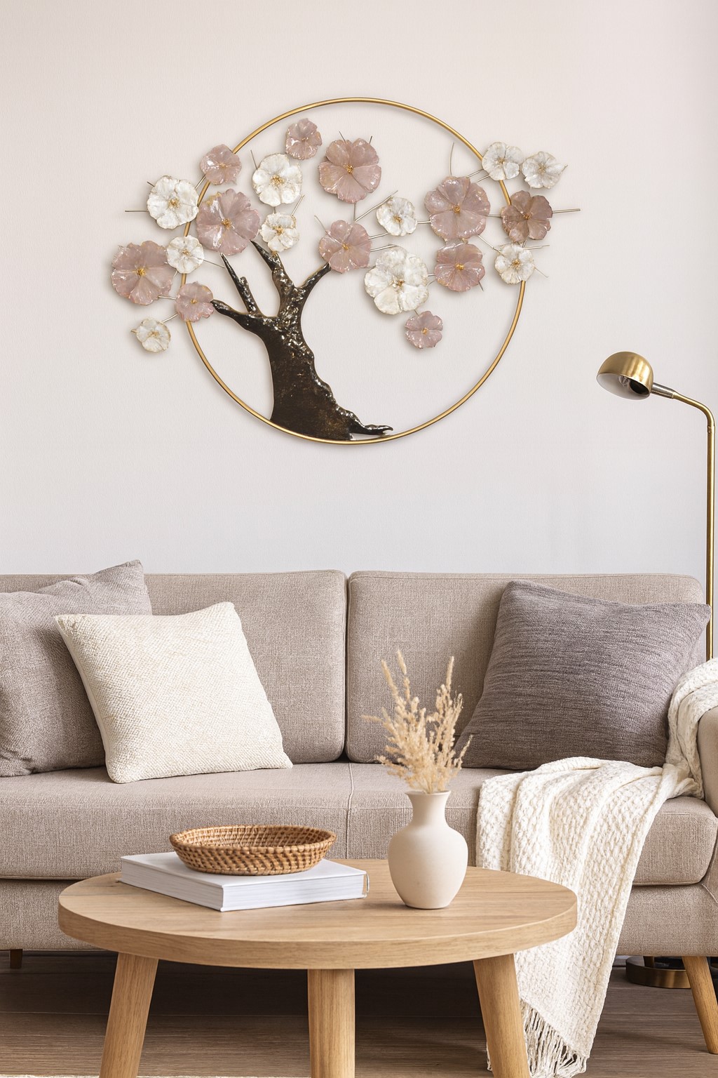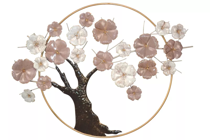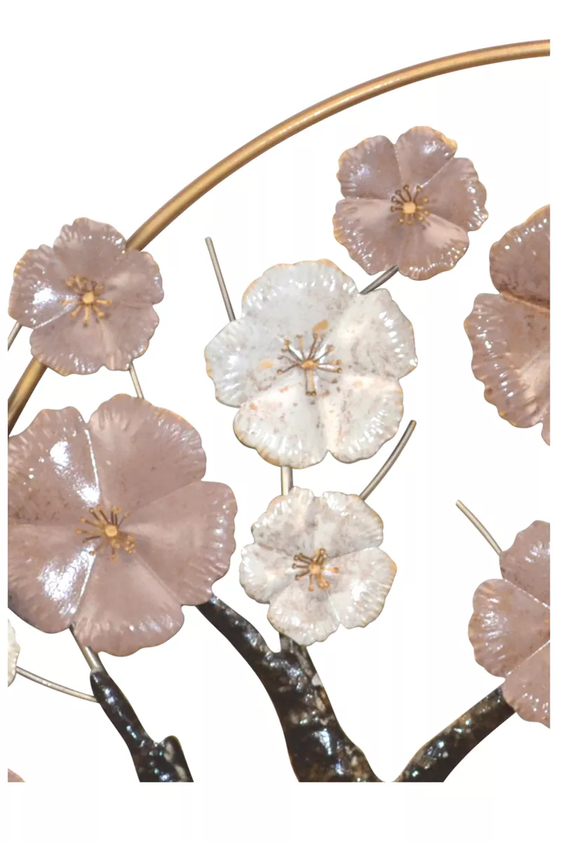 Diese elegante Wanddekoration aus Metall verleiht jedem Raum eine stilvolle und romantische Atmosphäre. Im Mittelpunkt steht ein kunstvoll gearbeitetes Baummotiv, dessen filigrane Äste von zahlreichen rosé- und cremefarbenen Blüten mit goldfarbenen Knospen geschmückt sind. Der runde Metallrahmen ist in edlem Goldton lackiert und umrahmt das Motiv harmonisch, wodurch ein luxuriöser und zugleich natürlicher Gesamteindruck entsteht.