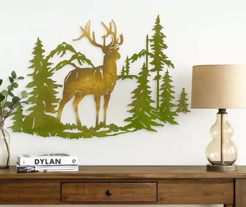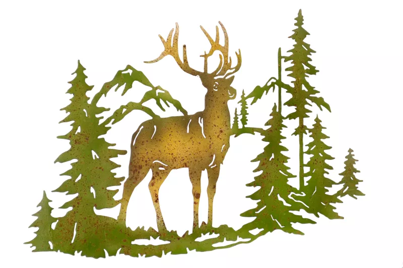 Diese kunstvolle Metall-Wanddekoration mit Hirschmotiv bringt das Gefühl von Natur und Berglandschaft direkt in dein Zuhause. Das detailreiche Design zeigt einen majestätischen Hirsch vor einer Kulisse aus Bäumen und Bergen – ein echtes Highlight für alle, die den rustikalen Landhausstil und die Natur lieben.