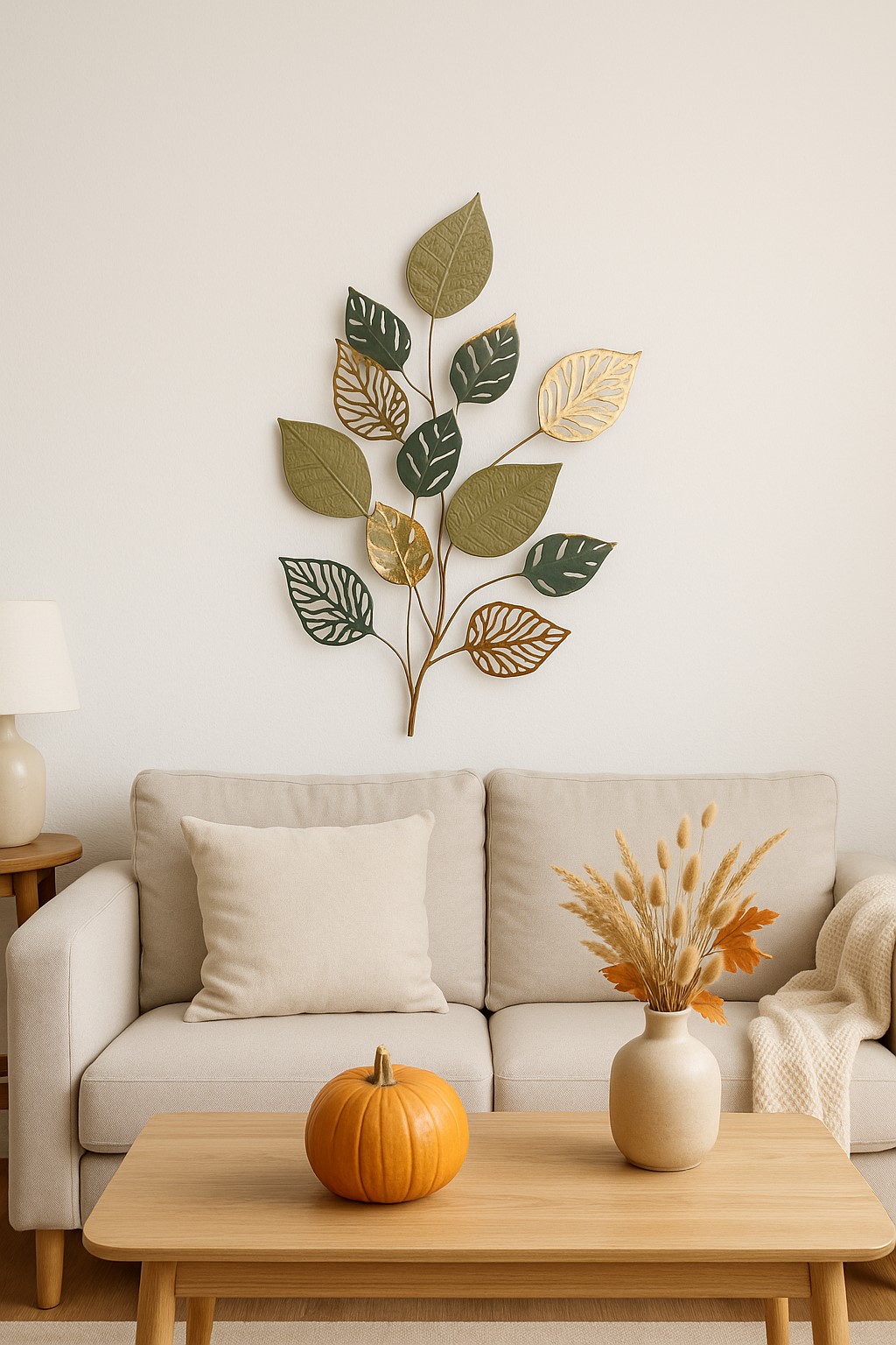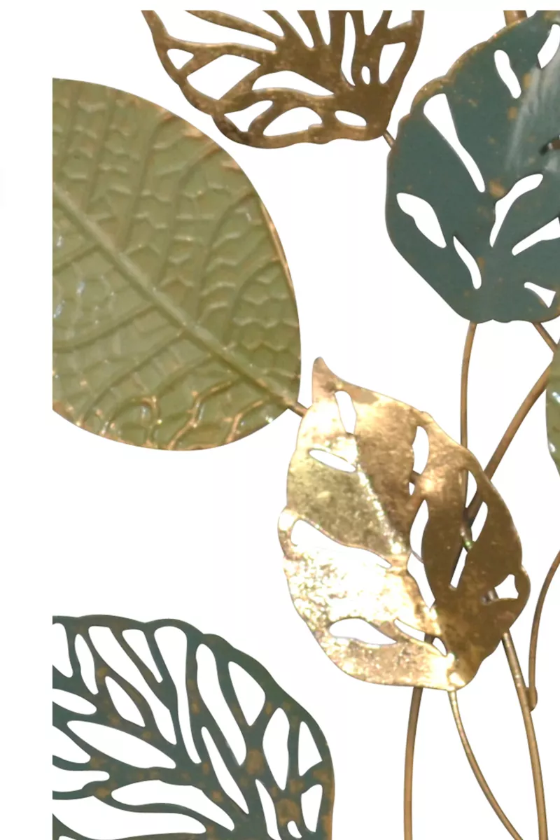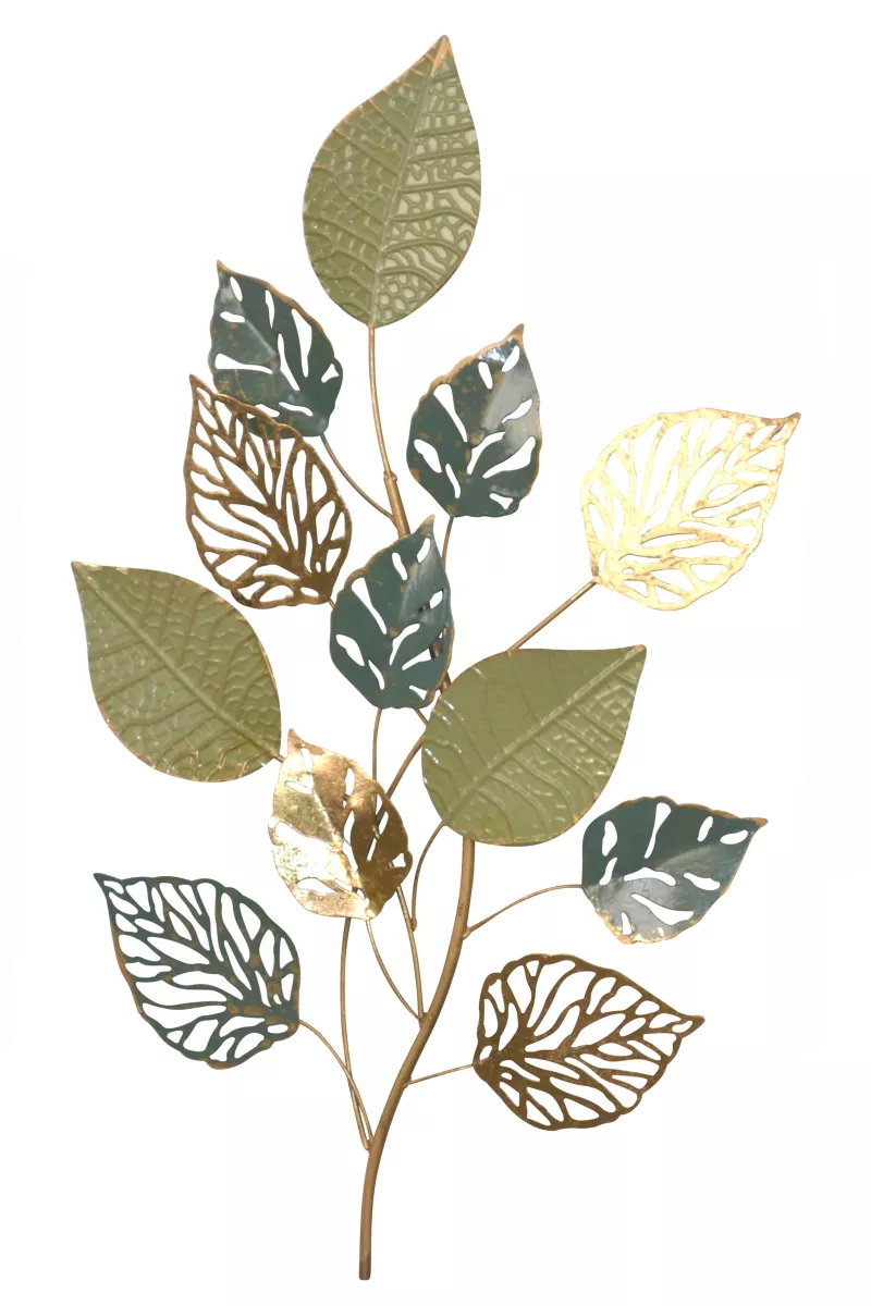 Verleihen Sie Ihrem Zuhause eine stilvolle, natürliche Atmosphäre mit dieser hochwertigen Wanddekoration aus Metall. Der kunstvoll gestaltete Metallzweig mit Blättern besticht durch seine detailreiche Verarbeitung und die harmonische Kombination aus verschiedenen Grüntönen und edlem Goldfinish.
