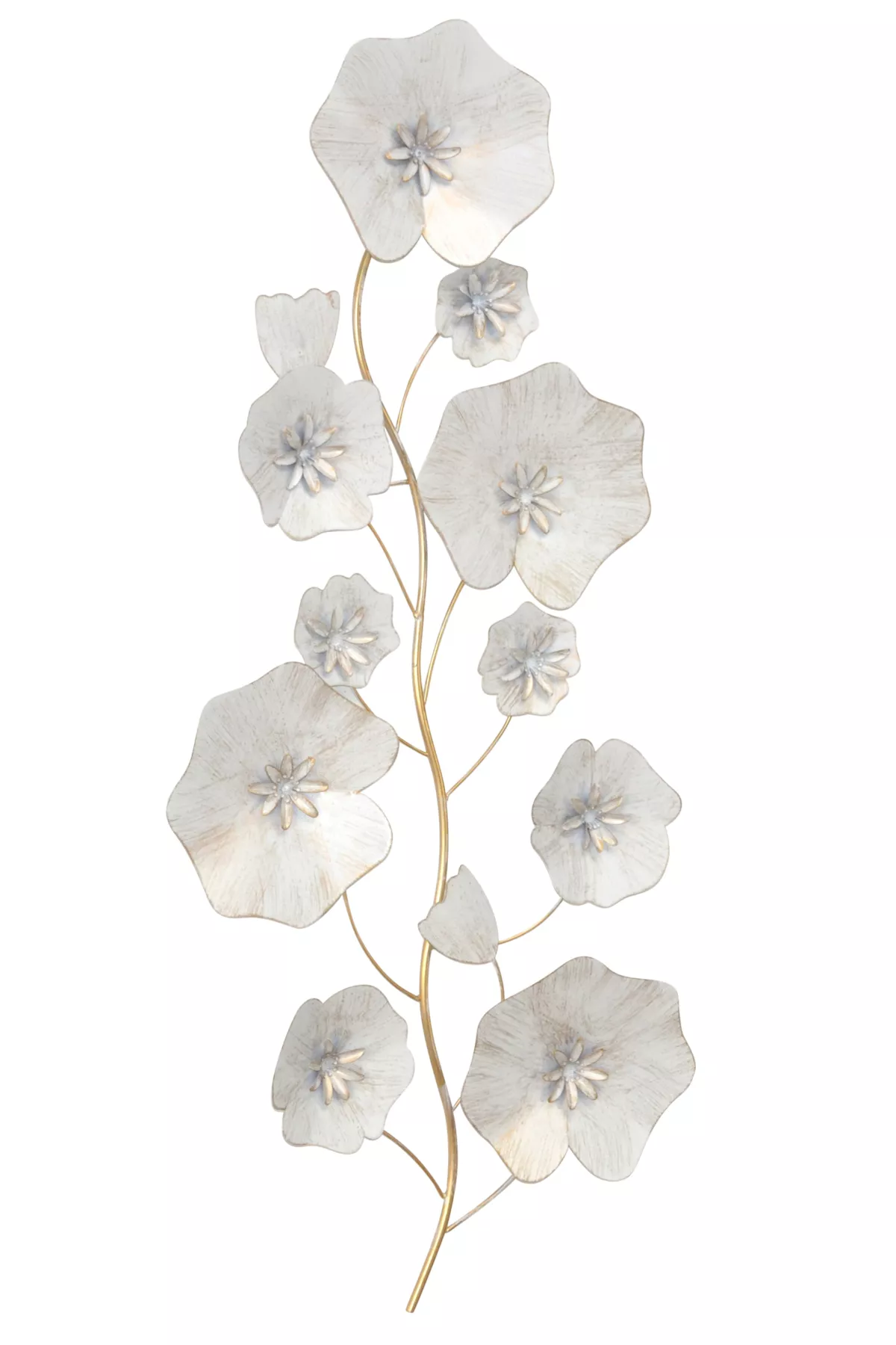 Diese elegante Wanddekoration aus Metall verleiht jedem Raum einen Hauch von Stil und Leichtigkeit. Die kunstvoll gearbeiteten Blüten in unterschiedlichen Größen sind cremeweiß lackiert und goldfarben gewischt, wodurch ein edler, warmer Schimmer entsteht. Die filigranen Metallstiele in Goldoptik runden das harmonische Gesamtbild ab. Mit ihren Maßen von ca. 40 × 90 × 4 cm (B/H/T) ist sie ein echter Blickfang – ob im Wohnzimmer, Flur oder Schlafzimmer.