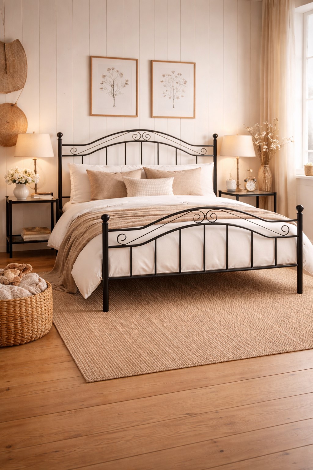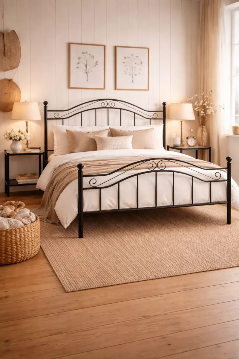 Die schwarz pulverbeschichtete Metalloberfläche sorgt nicht nur für eine edle Optik, sondern auch für Stabilität und Langlebigkeit. Besonders schön wirkt das Bett in Kombination mit warmen Holzmöbeln und natürlichen Materialien – perfekt für ein individuelles, gemütliches Schlafzimmer im Landhausstil.