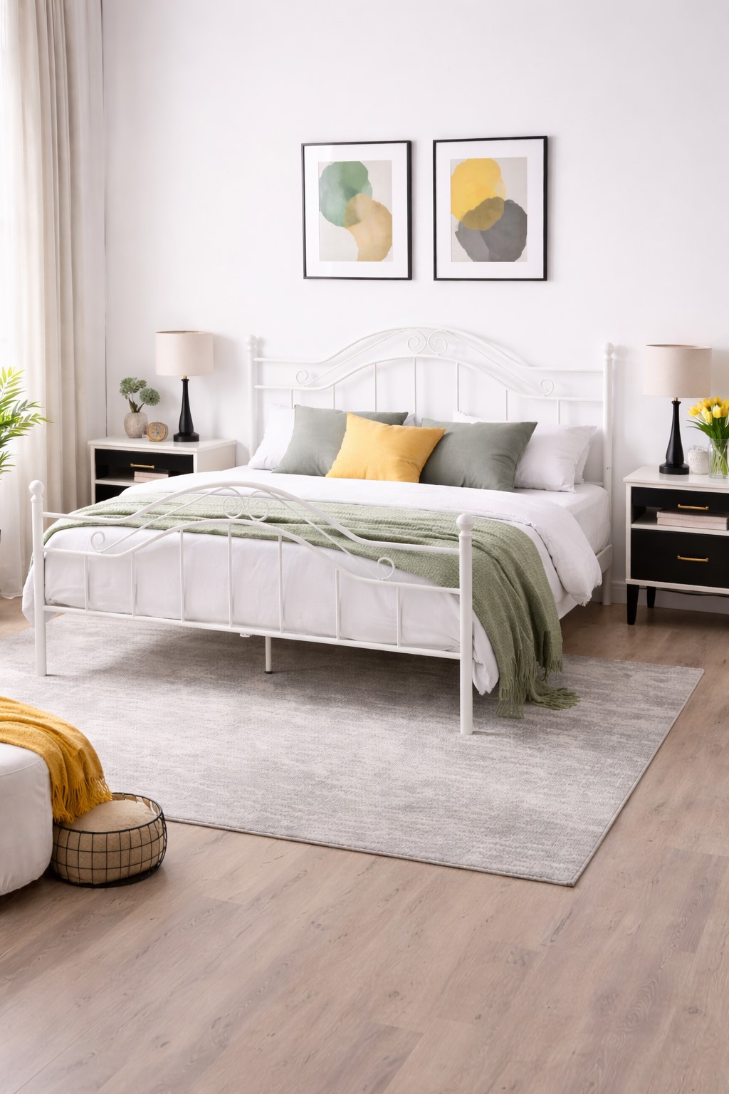 Verleihen Sie Ihrem Schlafzimmer ein elegantes Ambiente mit diesem stilvollen Metallbett in cremeweiß. Das romantische Design mit filigranen Details sorgt für eine gemütliche und einladende Atmosphäre und macht das Bett zum dekorativen Highlight in jedem Raum. Besonders harmonisch lässt sich das Doppelbett mit Holzmöbeln kombinieren, um ein individuelles und geschmackvolles Wohnkonzept zu schaffen.