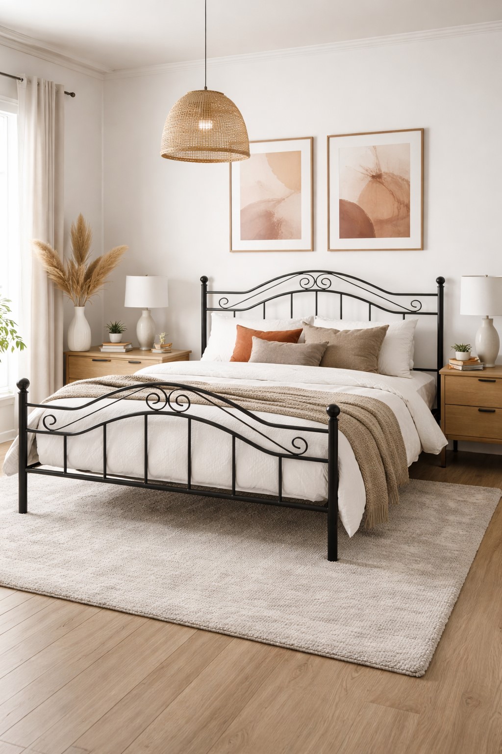 Die hochwertige Verarbeitung aus schwarz pulverbeschichtetem Metall garantiert Stabilität und Langlebigkeit. In Kombination mit warmen Holzmöbeln entsteht ein harmonisches Gesamtbild, das Gemütlichkeit und Individualität ausstrahlt – ideal für Ihr persönliches Wohlfühl-Schlafzimmer.