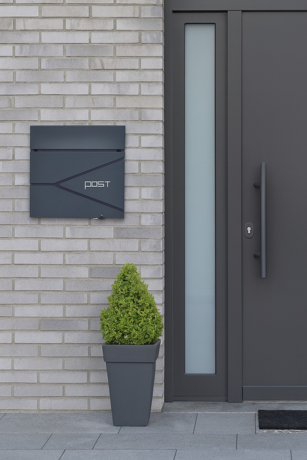 Dieser hochwertige Metallbriefkasten in Anthrazit überzeugt durch sein modernes, geradliniges Design und eine durchdachte Funktionalität – ideal für zeitgemäße Hauseingänge. Die anthrazitfarbene Oberfläche verleiht dem Briefkasten eine elegante, moderne Optik und ist gleichzeitig robust und pflegeleicht.