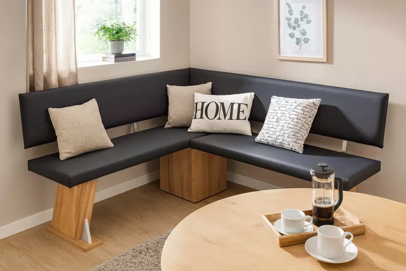 Gestell der modernen Eckbank ist aus Holzwerkstoff gefertigt und mit einer hochwertigen Melaminharzbeschichtung in Eichedekor beschichtet.