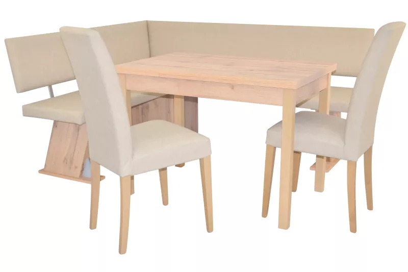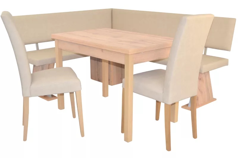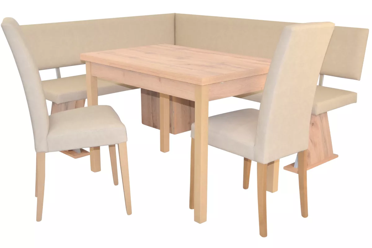 Moderne Eckbankgruppe bestehend aus einer großen Eckbank, einen Esstisch mit Auszugsfunktion und zwei Massivholzstühlen.