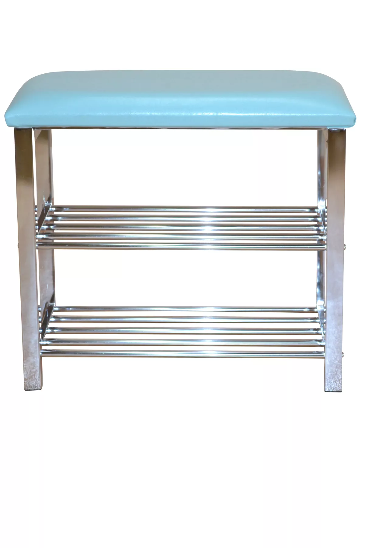 Unterhalb der Sitzfläche bieten zwei verchromte Gitterablagen aus Stahlrohr praktischen Stauraum. Hier lassen sich bis zu ca. 6 Paar Schuhe ordentlich und griffbereit unterbringen. Die offene Gitterstruktur sorgt dabei für eine gute Belüftung der Schuhe.