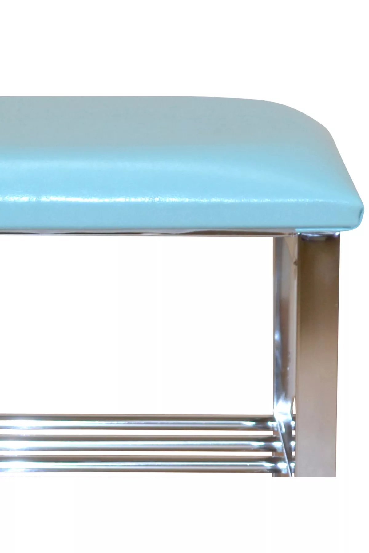 Das stabile Gestell aus verchromtem Vierkantstahl verleiht der Sitzbank eine elegante Optik und garantiert gleichzeitig eine hohe Standfestigkeit. Der feste, schaumstoffgepolsterte Sitz ist mit einem pflegeleichten und strapazierfähigen Kunstlederbezug (100 % Polyurethan) in frischem Türkis bezogen – ein echter Blickfang mit Wohlfühlfaktor.