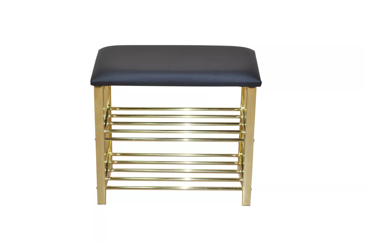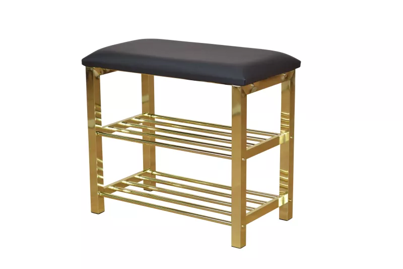 Das stabile Gestell aus Vierkantstahl, hochwertig messingfarben beschichtet, verleiht der kleinen Bank nicht nur einen sicheren Stand, sondern auch einen eleganten, modernen Look. Zwei praktische Gitterablagen aus Stahlrohr, ebenfalls in trendigem Messingfarben, bieten zusätzlichen Stauraum und eignen sich ideal zum Abstellen von Schuhen oder kleinen Alltagsgegenständen.